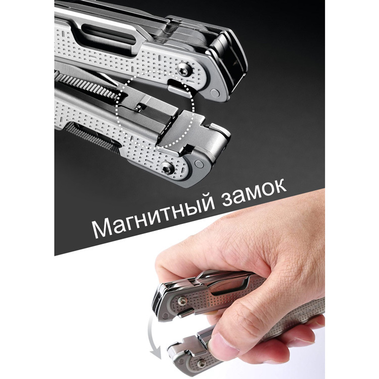 Многофункциональный мультитул с магнитными фиксаторами ножей и бит, с легким доступом ко всем инструментам — их легко достать одной рукой. В числе опций — ножницы, напильник, несколько видов отверток, шило, кусачки, острогубцы, плоскогубцы. Все инструменты сделаны из прочной нержавеющей стали, долговечной. Она долго сохраняет остроту заточки.  Длина мультитула в сложенном виде — около 11 см. Вес — 243 грамма. В комплект входит нейлоновый чехол, защищающий инструмент от загрязнений. Такой мультитул станет отличным подарком тому, кто предпочитает всегда иметь под рукой функциональный набор инструментов и делать мелкий ремонт своими руками.