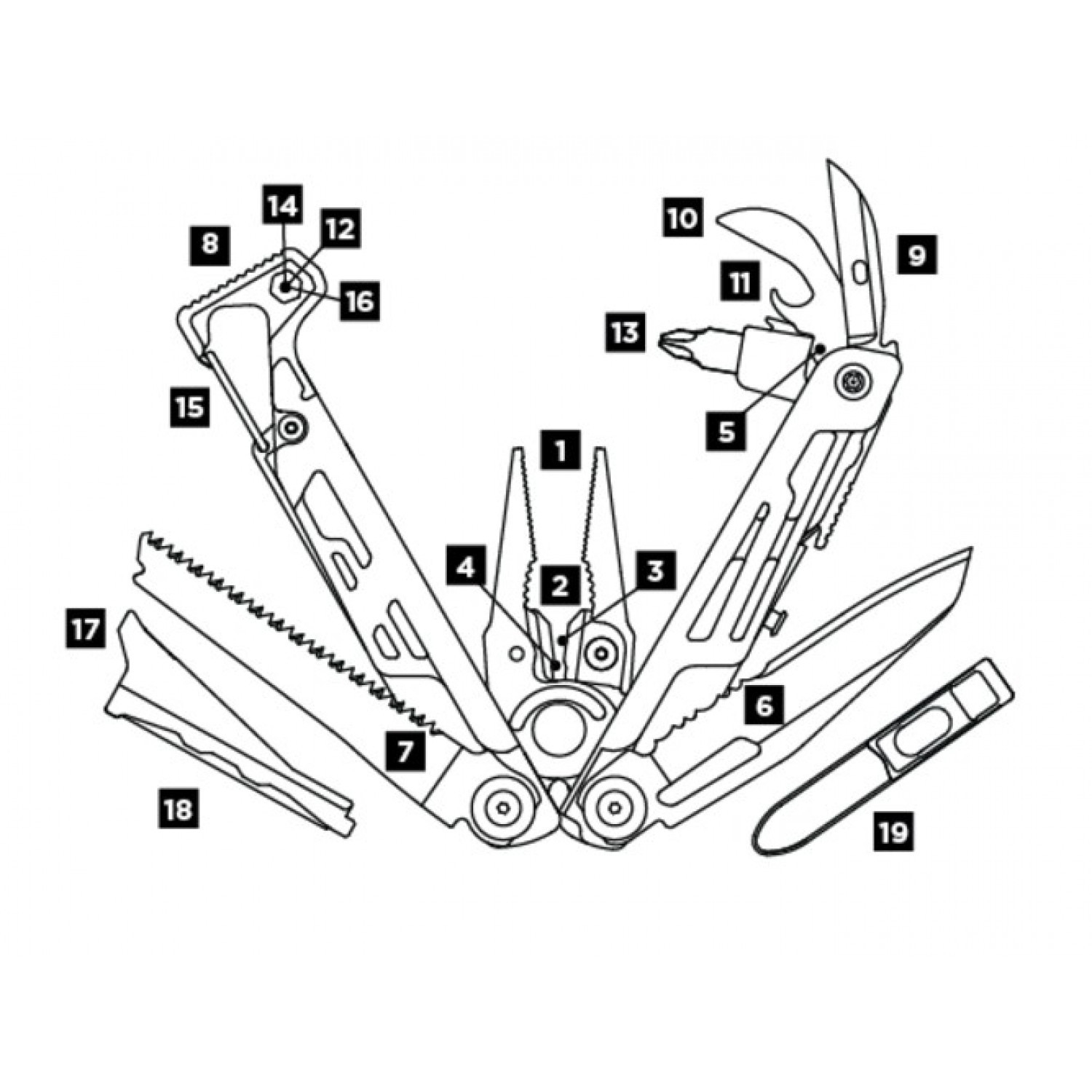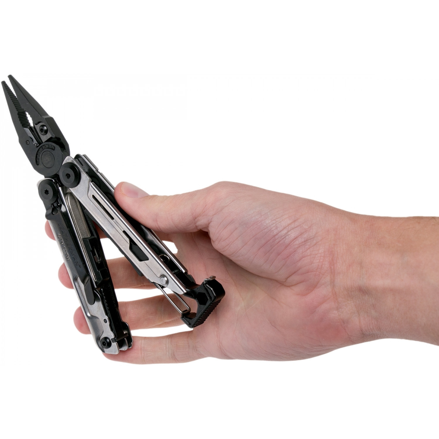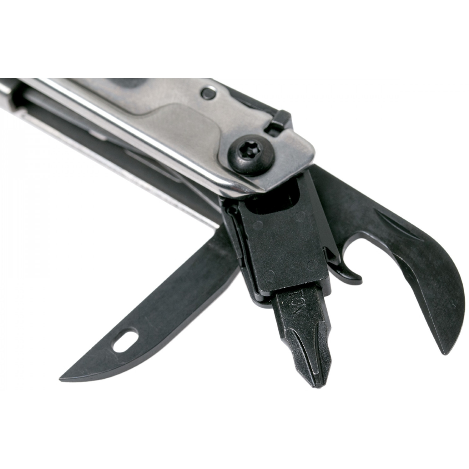 Этот мультитул рассчитан, в первую очередь, на туристов и любителей вылазок на природу. Его особенность — наличие огнива и свистка, которые могут пригодиться вдали от дома, чтобы развести костер или подать сигнал. Помимо этого, он также оснащен сменными кусачками, острогубцами, пассатижами, открывалками, отвертками. Есть точилка для ножей, держатели бит, накидной гаечный ключ и другие полезные функции. Дополнительное покрытие инструментов карбидом вольфрама придает им черный цвет, защищает от коррозии и механических повреждений. В набор входит нейлоновый чехол с креплением для ремня. Вес изделия — 215 граммов, длина в сложенном виде — 11,5 сантиметров.