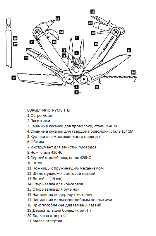 Инструменты мультитула Leatherman Surge:
