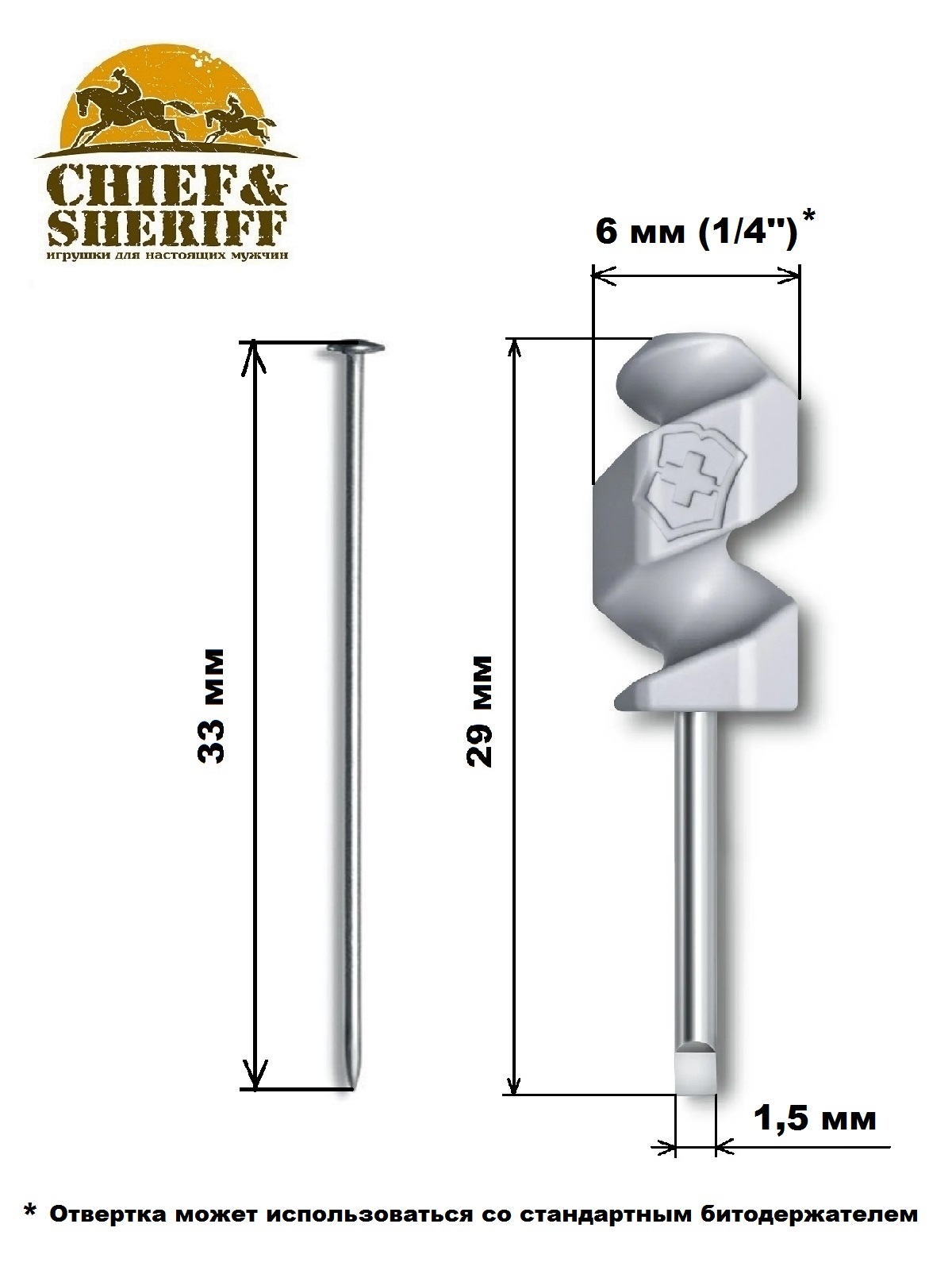 Отвертка Victorinox легко и прочно вворачивается в штопор, давая возможность иметь под рукой дополнительный инструмент. Она позволит откручивать мелкие детали, например, в часах, очках, фонариках, детских игрушках с крышками. Шестигранная форма рукоятки отвертки размером 1/4'' позволяет вставить ее также и в стандартный битодержатель.