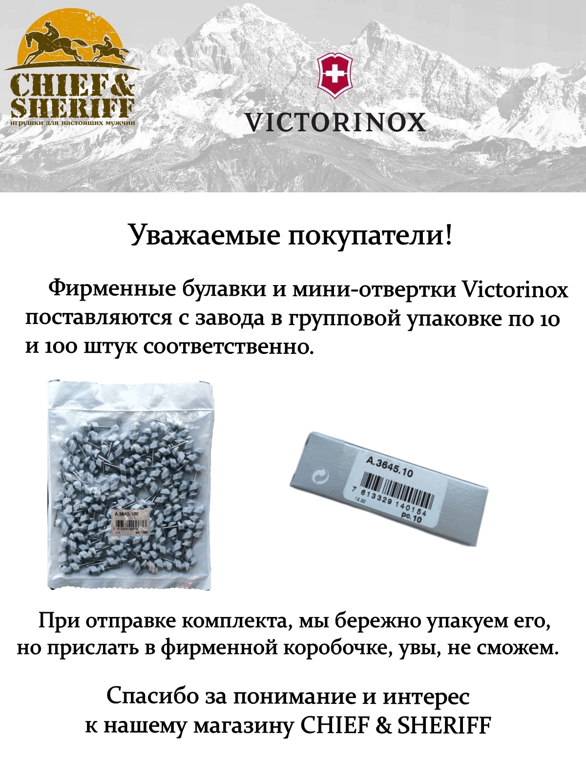 Булавка артикула А.3645 и отвертка артикула А.3643 также подходит для замены вышедших из строя или утерянных инструментов в тех моделях, где они входит в комплектацию: Victorinox Compact, Victorinox Cyber Tool, Victorinox Swiss Champ.