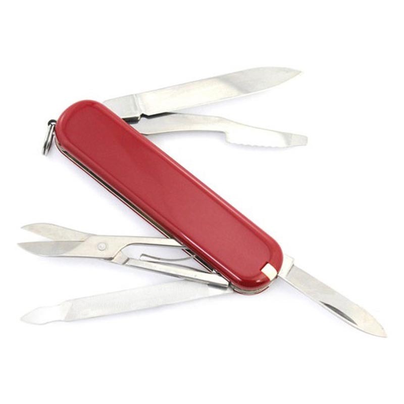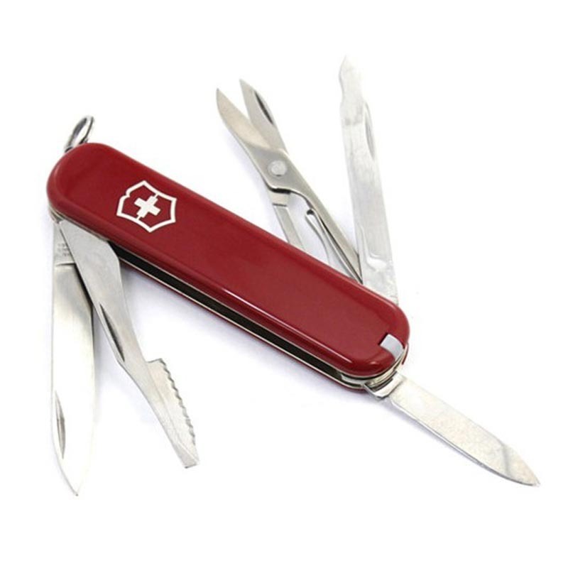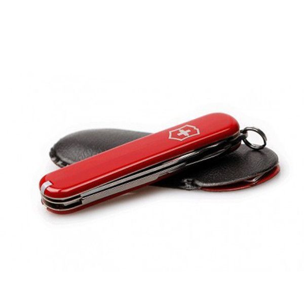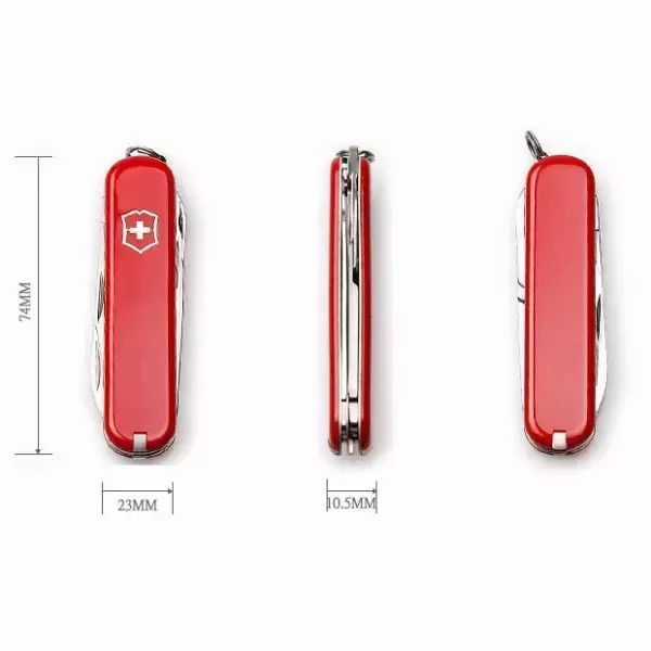 Небольшой швейцарский нож в сложенном виде имеет длину всего 7,4 сантиметра. Рукоять красного цвета не имеет рисунков и украшена только логотипом производителя. У ножа десять функций, среди которых — два лезвия, пилка для ногтей, нож для очистки цитрусовых, пинцет, отвертка, зубочистка, ножницы. Удобная рукоять изделия выполнена из ABS-пластика — материала с очень высокой стойкостью к механическим и термическим воздействиям. Нож весит 45 граммов, поэтому станет оптимальным полезным мужским аксессуаром на каждый день. Данная модель поставляется в мягком чехле без фирменной коробки.