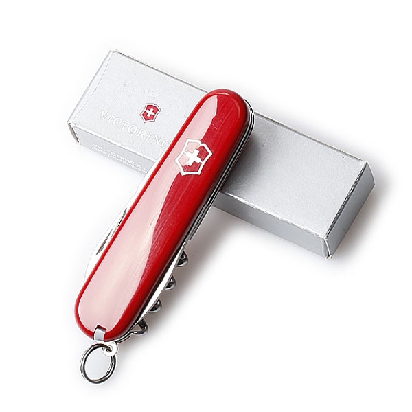Швейцарский армейский нож, в сложенной виде его длина 8,4 см. У ножа 12 функций, его корпус красного цвета изготовлен из ударопрочного, устойчивого к царапинам пластика. В числе функций — большое лезвие, пилка для ногтей, штопор, консервный нож, отвертка, инструмент для снятия изоляции, шило, пинцет, зубочистка. Такой компактный, удобный и надежный нож всегда пригодится путешественнику, туристу, рыбаку или охотнику. Все его инструменты изготовлены из прочной нержавеющей стали, которая отлично сохраняет остроту заточки в течение долгого времени. Вес ножа — 60 граммов.
