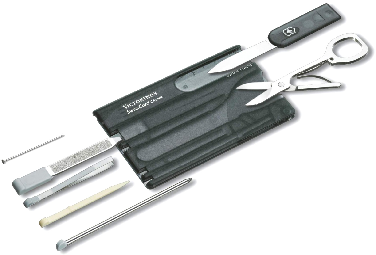 Даже если у вас есть складной армейский нож, швейцарская карточка от Victorinox займет немного места, уместившись даже в портмоне (ведь она немногим больше банковской карты). Однако эта тонкая штучка легко трансформируется в целый комплект инструментов: лезвие для вскрытия конвертов, четыре отвертки разного размера – две плоские и две крестовые, лупа, светодиодный фонарик, линейки со шкалой в сантиметрах и дюймах, булавка, пинцет, ножницы и шариковая ручка – целый ремонтно-маникюрный набор у вас на ладони!
