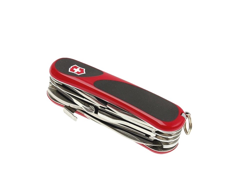Швейцарский нож Victorinox EvoGrip отличается ручкой специальной формы: она хорошо лежит в руке и не скользит, а сочетание красного и черного пластика не позволяет ножу остаться незамеченным и потеряться. Купив практичный складник, вы получите в свое распоряжение два десятка функций – не только лезвия, ножницы, отвертки, но и плоскогубцы, гаечный ключ и другие инструменты.