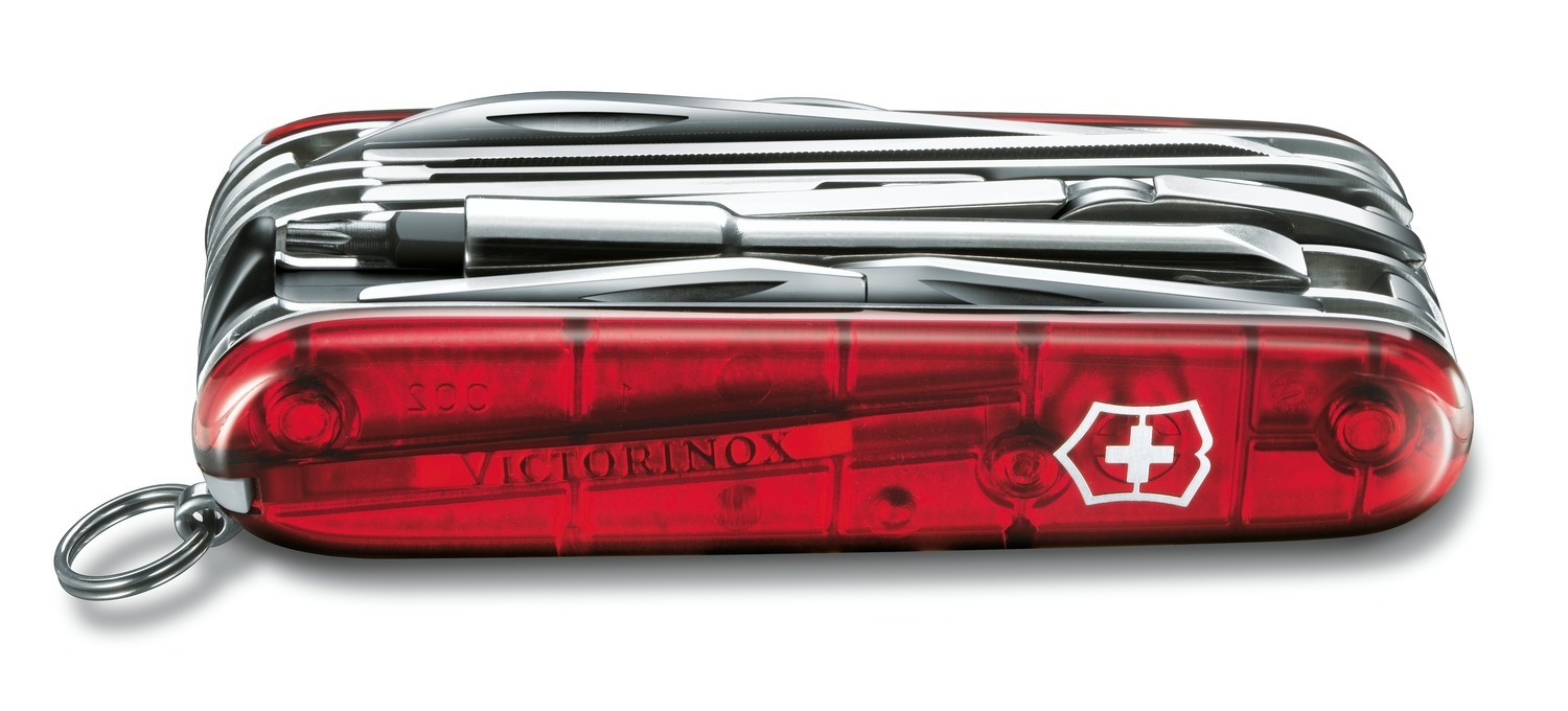 Перочинный нож Victorinox CyberTool – настоящий супергерой среди швейцарских ножей: купить его можно в качестве замены десяткам инструментов. В нем есть не только обычные лезвия, открывалки, отвертки, пилки и ножницы, но и многофункциональный ключ с гнездами для шестигранников и различными насадками. Также привлекает к себе внимание полупрозрачный неординарный корпус модели.