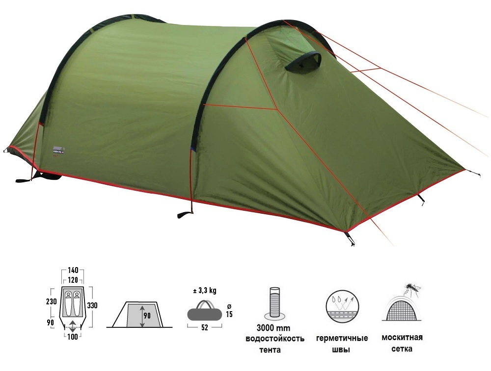 Компактная двухслойная палатка туннельного типа (полубочка) с тамбуром для хранения снаряжения и спальным отсеком Extra Long (230 см).  Рассчитана на 2 человек и отлично подойдет для активного кемпинга.