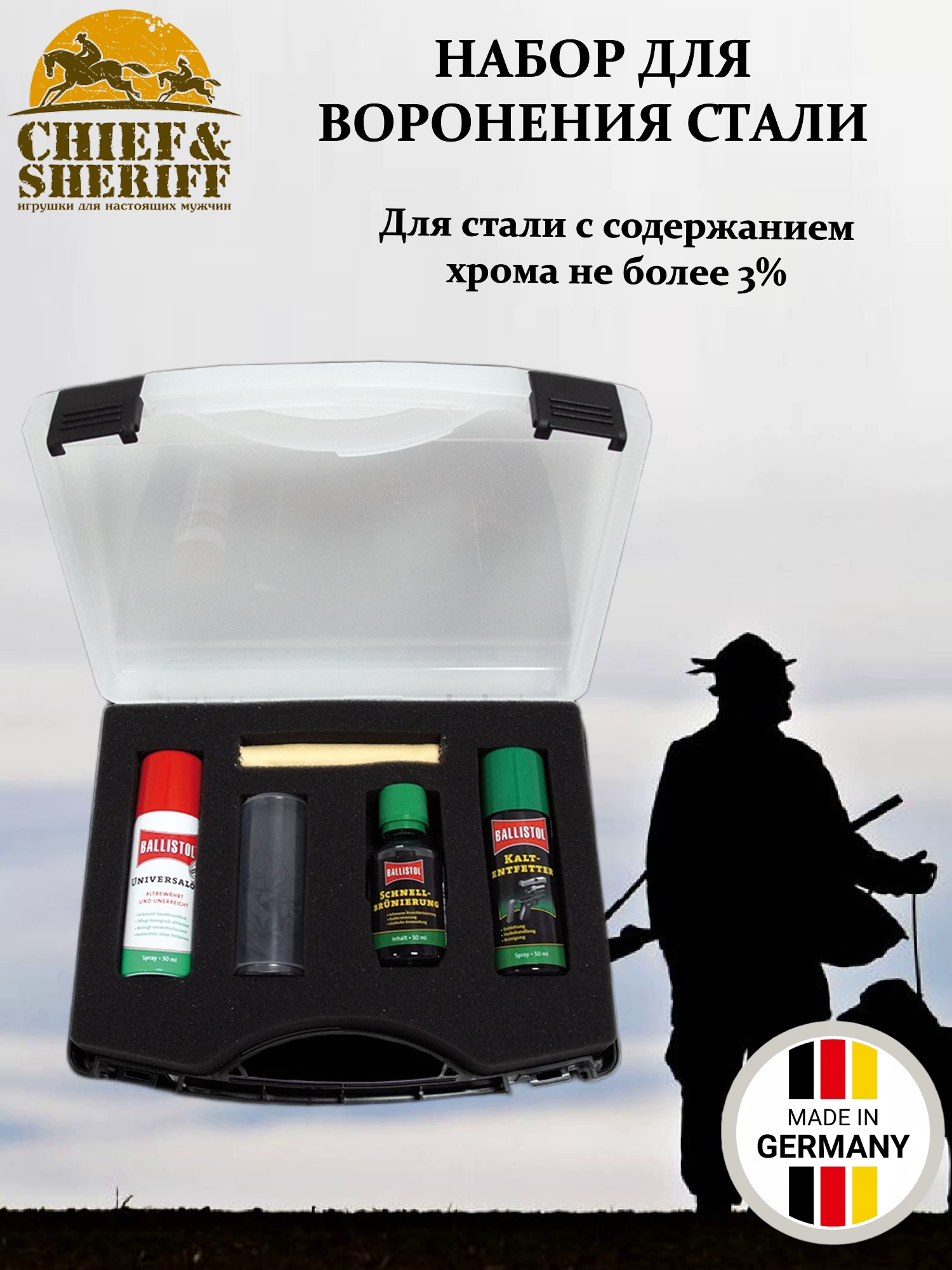 Набор для воронения оружия Ballistol Quick Browning Set (нем. – Ballistol-Set Schnellbrunierung) содержит все необходимое для подготовки и холодного воронения металлической поверхности вашего огнестрельного оружия. Вы легко получите глубокий черный матовый блеск за короткое время.