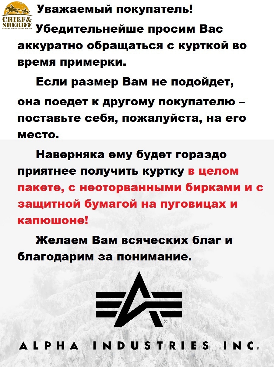 На куртке имеется маркировка "Честный знак". Компания Chief&Sheriff - официальный представитель Alpha Industries уже более 10 лет.