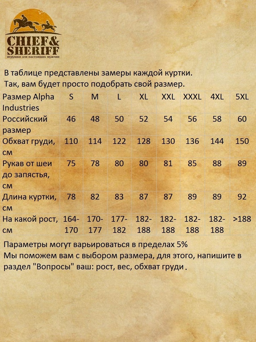 Если вы сомневаетесь в размере, пришлите, пожалуйста, нам свои: рост, вес, обхват груди, длину рукава от шеи до запястья, на info@chiefandsheriff.ru или в наш чат на сайте. Однако, обращаем ваше внимание на то, что ответственность за выбор размера лежит на вас, мы лишь рекомендуем вам тот или иной размер. Если размер вам все-таки не подошел, мы без проблем поменяем вам куртку или вернем деньги, но все необходимые пересылки в этом случае - за ваш счет.