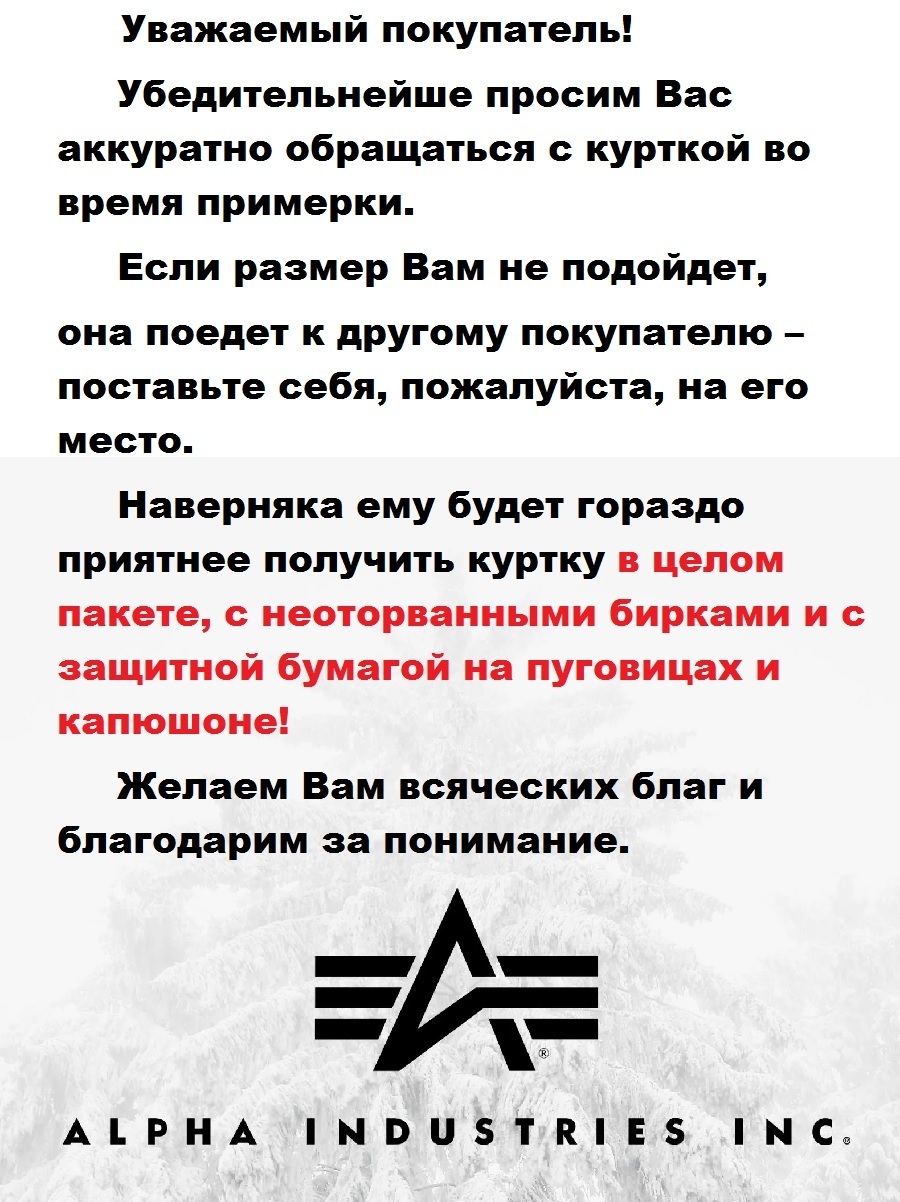 Ответ: - Да, есть. Бесплатный самовывоз можно осуществить в нашем офисе, однако, самовывозом можно забрать только куртки Alpha Industries.