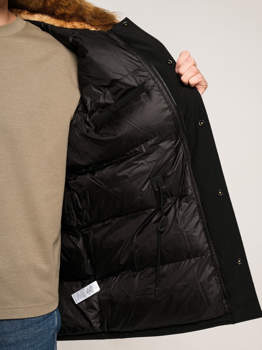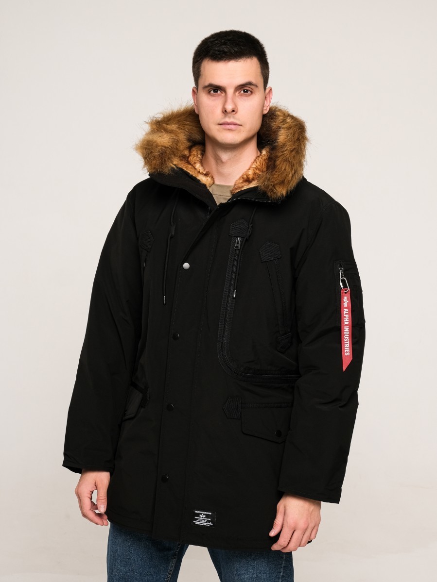 Теплая куртка-аляска для мужчин в красивом черном цвете. Рассчитана на экстремально низкие температуры, до –40 градусов Цельсия, имеет длину до середины бедра. На капюшоне — съемныискусственный мех, сам капюшон регулируется по ширине при помощи шнурков, внутри куртки утеплитель — искусственный пух. Материал верха — 100% полиэстер с водоотталкивающими свойствами, не пропускающая холод. Манжеты мягкие, из плотного трикотажа. Куртка застегивается на прочную пластиковую молнию. У нее шесть больших карманов, включая внутренний, а также небольшой на рукаве. Его украшает красный брелок с надписью: «Alpha Industries». На поясе внутри есть кулиска для регулировки ширины.