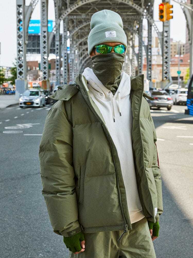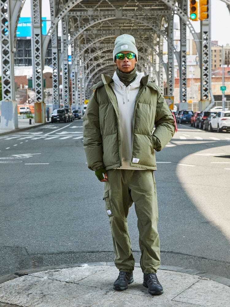 Пуховик имеет два внешних прорезных кармана на молнии, отделанные флисом, внутренний карман также на молнии, и, конечно, фирменный нарукавный карман MA-1 с брелоком «Alpha Industries».