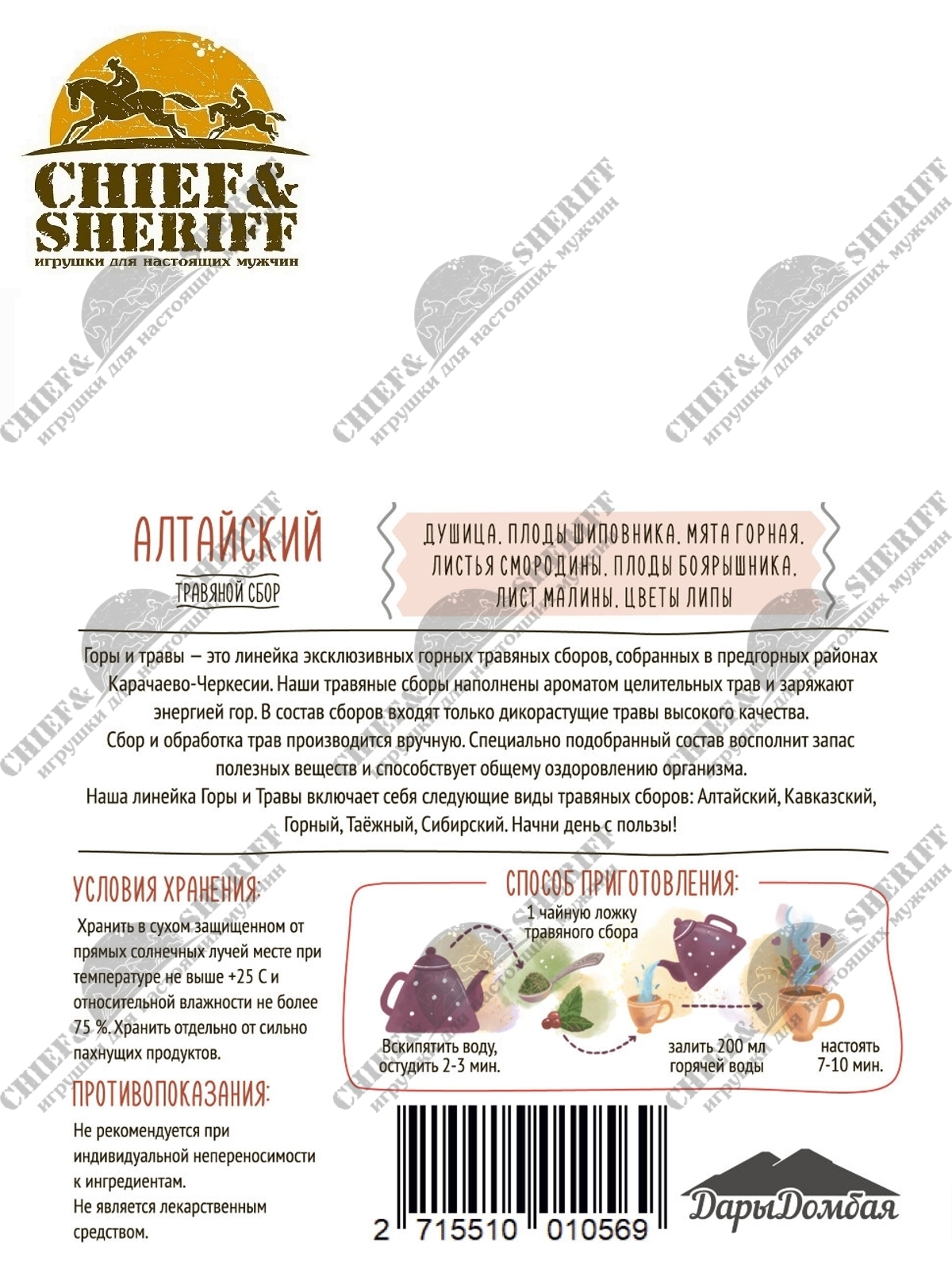 Ароматный целительный чай "Горы и Травы "Алтайский", дарит вам удовольствие и заряжает энергией. Травы и плоды входящие в состав травяного чая произрастают в экологически чистых районах. Настой золотистого цвета с приятным вкусом - идеальный напиток в любое время дня.