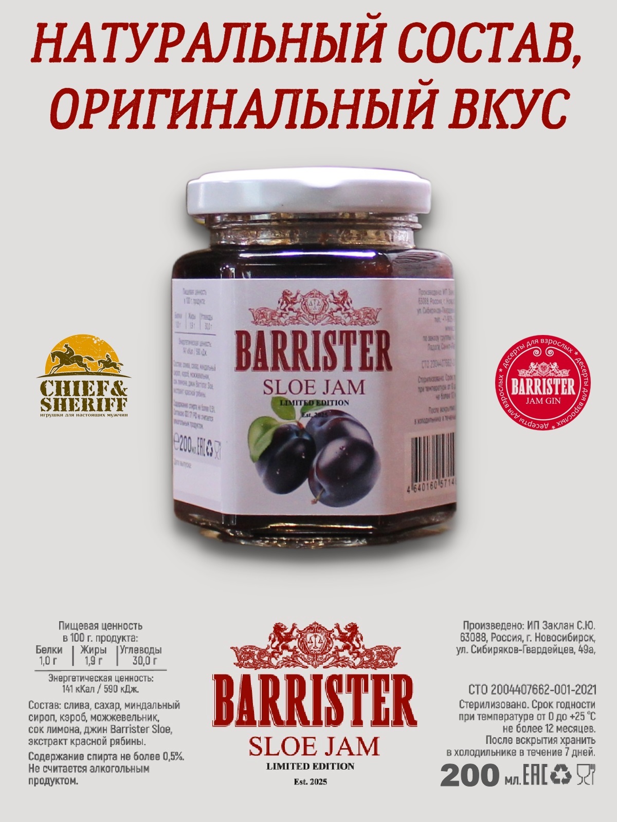 Джем Barrister Sloe - это уникальное сочетание сладости сливы и пряного вкуса можжевельника. Этот джем создан из натуральных ингредиентов, таких как слива, сахар, миндальный сироп, кэроб и сок лимона. Он также содержит экстракт красной рябины, который придает ему особый аромат и цвет.
