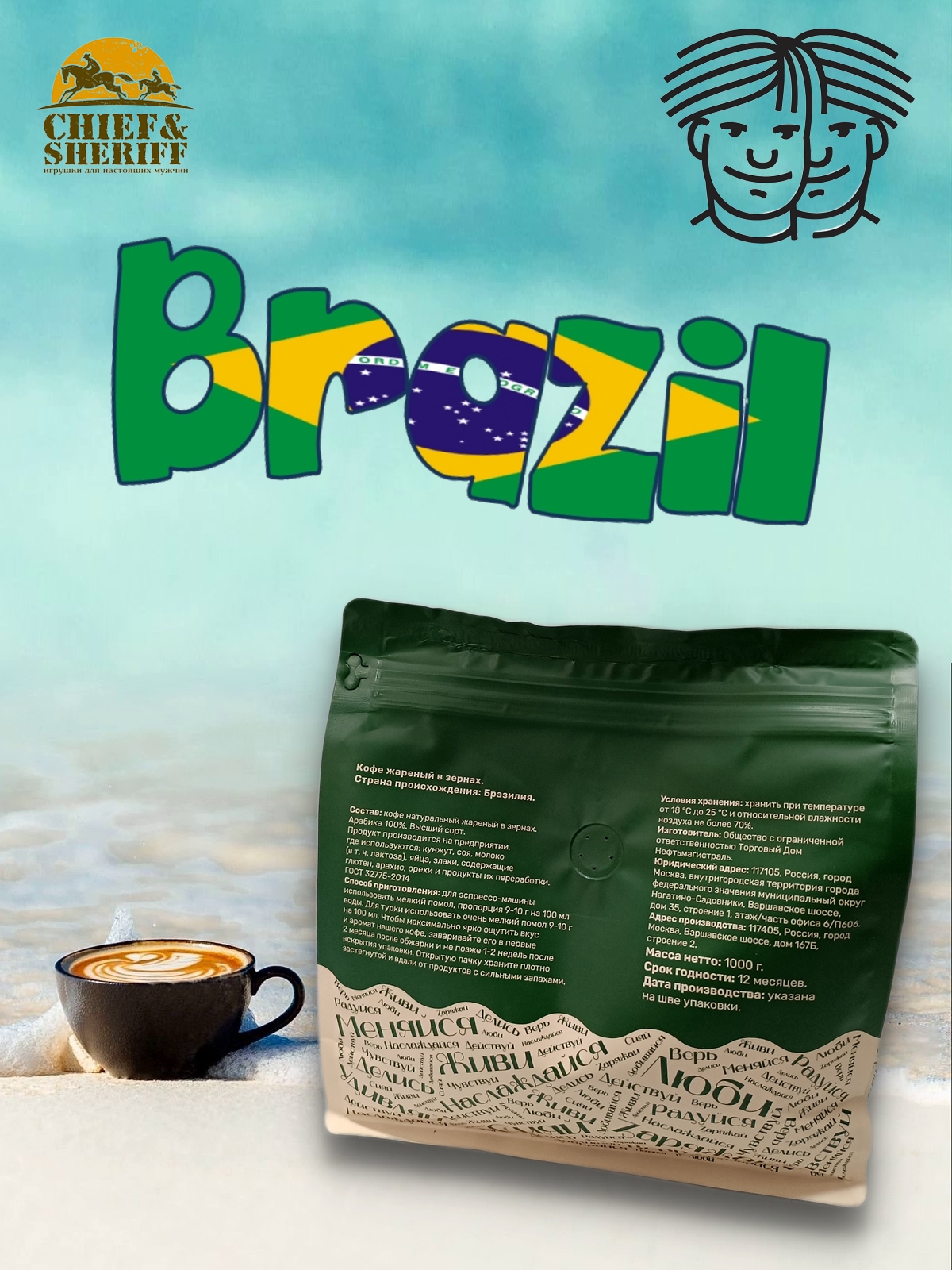 100% бразильская арабика собственной свежей обжарки, степень обжарки - средняя.
