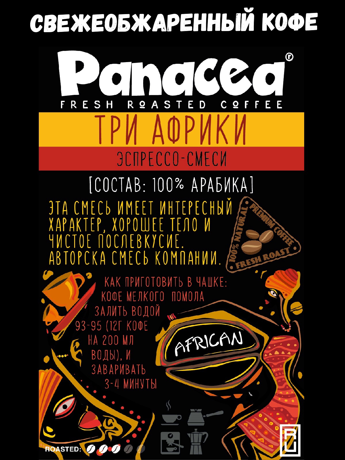 Три Африки -  это авторская смесь компании из трех сортов 100% Африканской арабики (Эфиопия Иргачефф, Эфиопия Сидамо и Уганда Рувензори). Смесь содержит в себе три степени обжарки, для каждой арабики своя индивидуальная обжарка. Эта смесь имеет интересный характер, хорошее тело и достаточно чистое послевкусие. Эфиопы — Иргачефф и сухо обработанное Сидамо — оставляют едва уловимые фруктов-ягодные отпечатки которые дополняются легкой горчинкой Угандийского. Эта эксклюзивная смесь также хороша со сливками и молоком.  Кофе упакован в пакет 250 г с клапаном дегазации и зип-замком, чтобы максимально сохранить вкус и аромат свежеобжаренного кофе. Хранить кофе в зернах рекомендуем в закрытом пакете при температуре до 25 градусов, избегать попадания воздуха, тепла и света. Молоть кофе желательно непосредственно перед приготовлением.