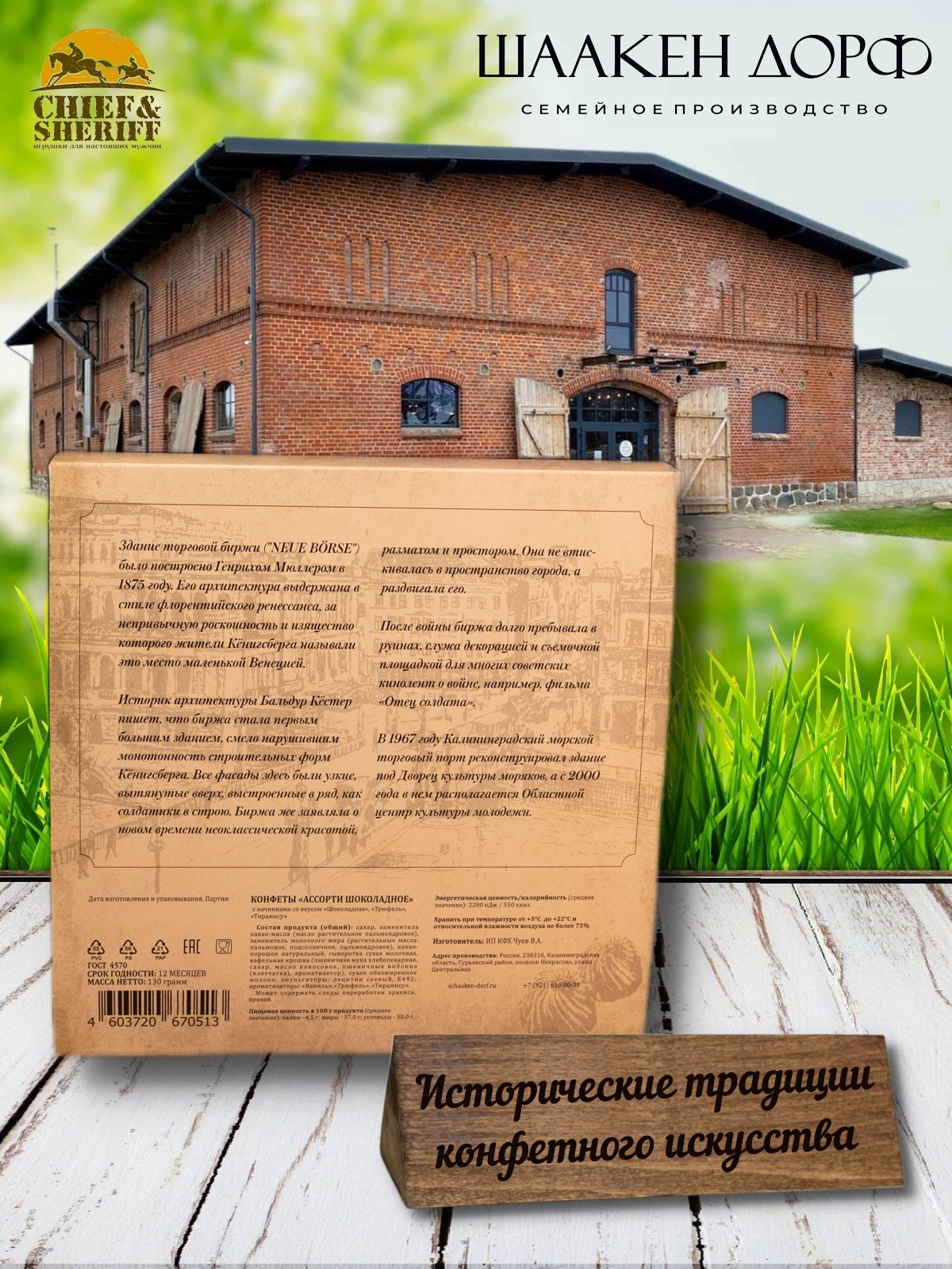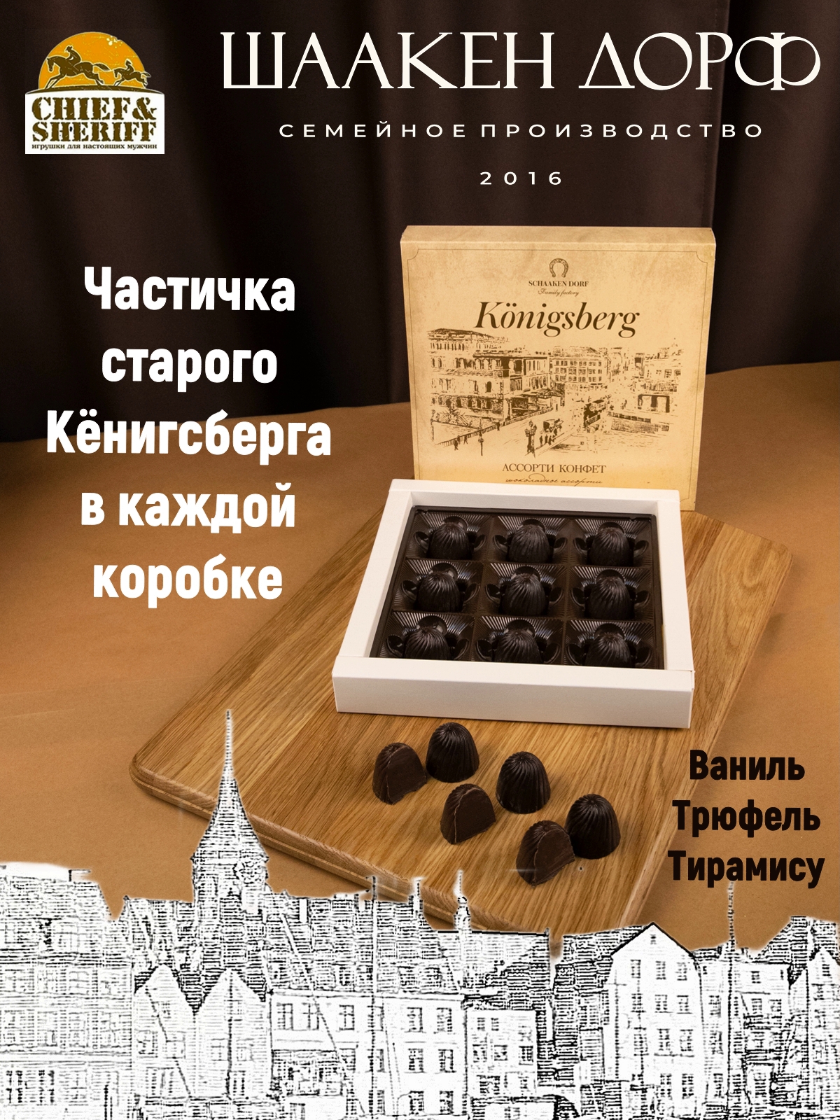 Шаакен Дорф - семейное производство сыра, марципана, шоколада, конфет и зефира. Производство компании Шаакен Дорф находится в Калининграде, в здании, которое когда-то было конюшней при замке Шаакен - рыцарей еще тевтонского ордена. Сейчас на первом этаже находится производство сыра. На втором этаже располагается небольшое кондитерское производство. Здесь вручную варится зефир, делаются карамелизированные апельсины в темном шоколаде, сублимированные ягоды, а также создается абсолютно разный и такой всеми полюбившийся калининградский марципан. В 2024 году, компания Шаакен Дорф стала победителем в номинациях «Лучшее туристическое направление года в номинации агротуризм», «Лучшее крестьянско-фермерское хозяйство», «Лучшее хозяйство в отрасли переработки молока», «Лучший объект туристического показа» и многих других!