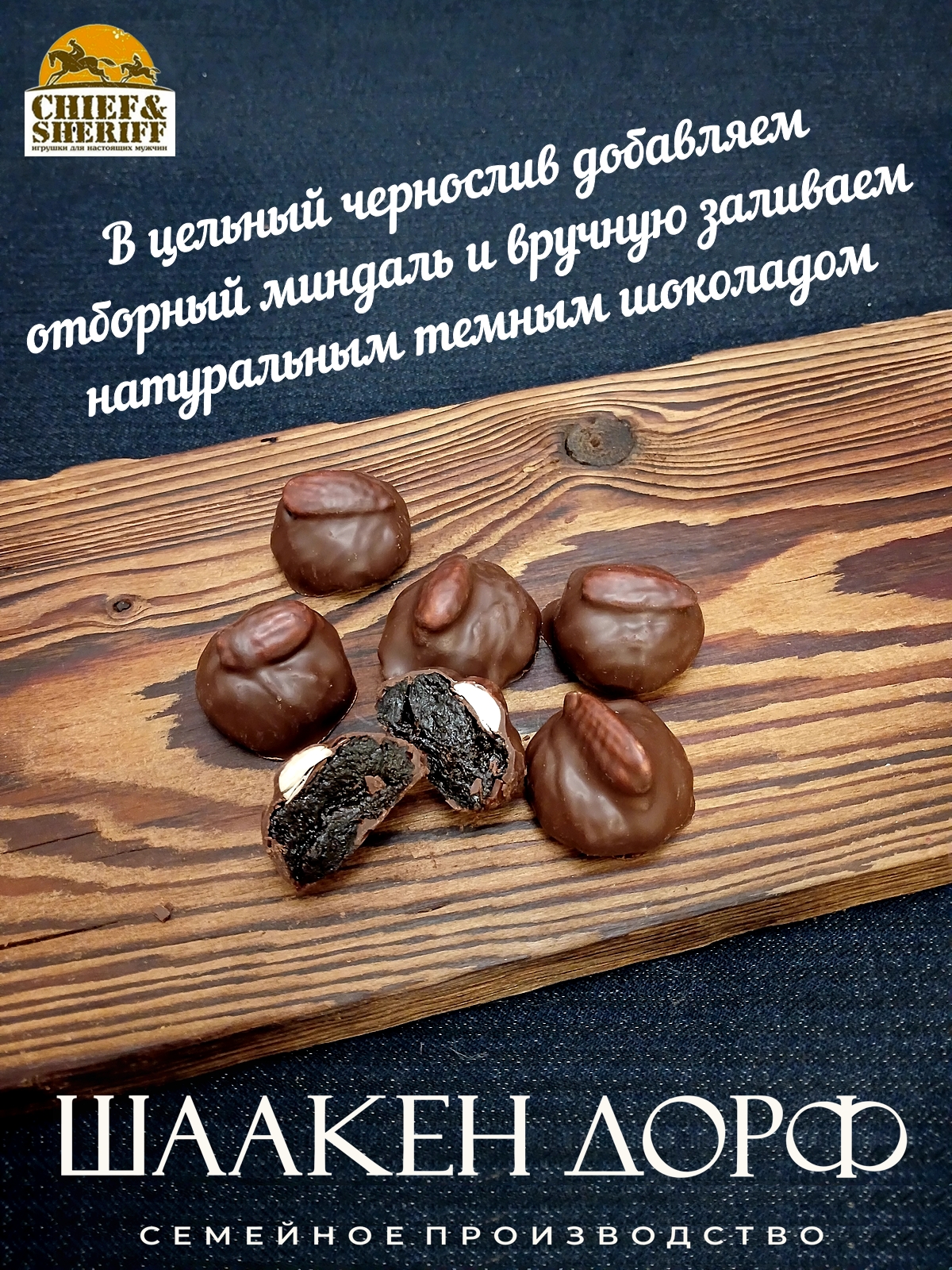 Цельный чернослив с миндалем в натуральном темном шоколаде.