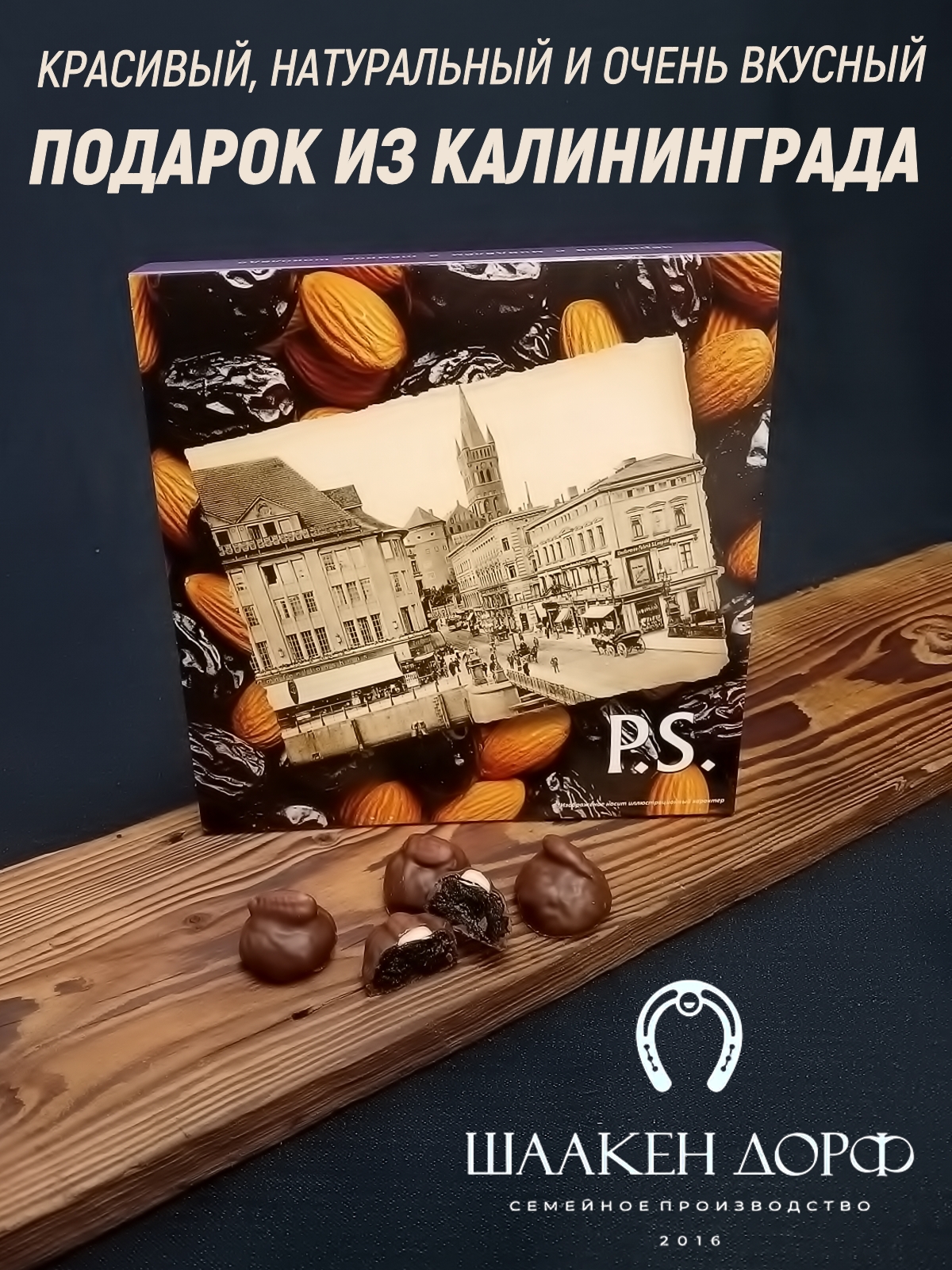 Эти шоколадные конфеты вручную изготовлены на семейном предприятии Шаакен Дорф, расположенном в части старинного замка Schaaken в Калининградской области. Здесь производят сыр и различные сладости - зефир, шоколад, драже из натуральных ягод и, конечно, знаменитый калининградский марципан. Компания Шаакен Дорф является обладателем множества наград в различных номинациях!