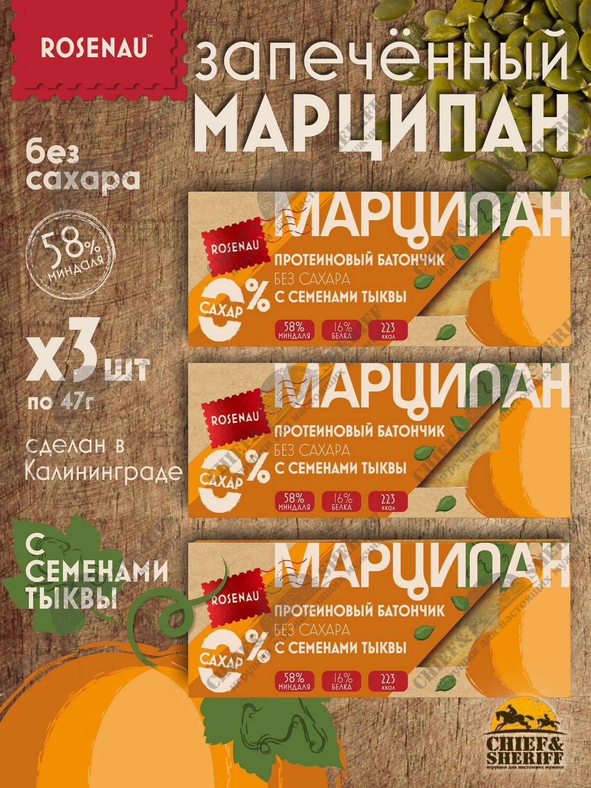 Марципан с семенами тыквы запеченный батончик без сахара, ROSENAU, 3 X 47 гр Марципан с семенами тыквы запеченный батончик без сахара, ROSENAU, 3 X 47 гр