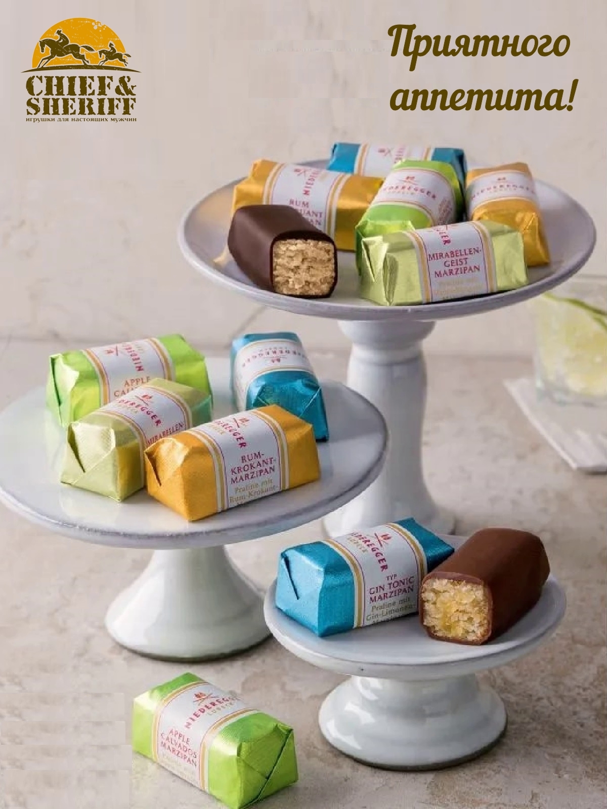 Пралине с рюмкой. Классические вариации алкогольного марципана Niederegger привносят исключительный шарм во вкус. Сделанные из сочного марципана и покрытые темным и молочным шоколадом, они превращаются в настоящее лакомство. Утонченные нотами джина и тоника, ломкого рома, ликера мирабель и яблочного кальвадоса, они предлагают разнообразное удовольствие от перекуса.