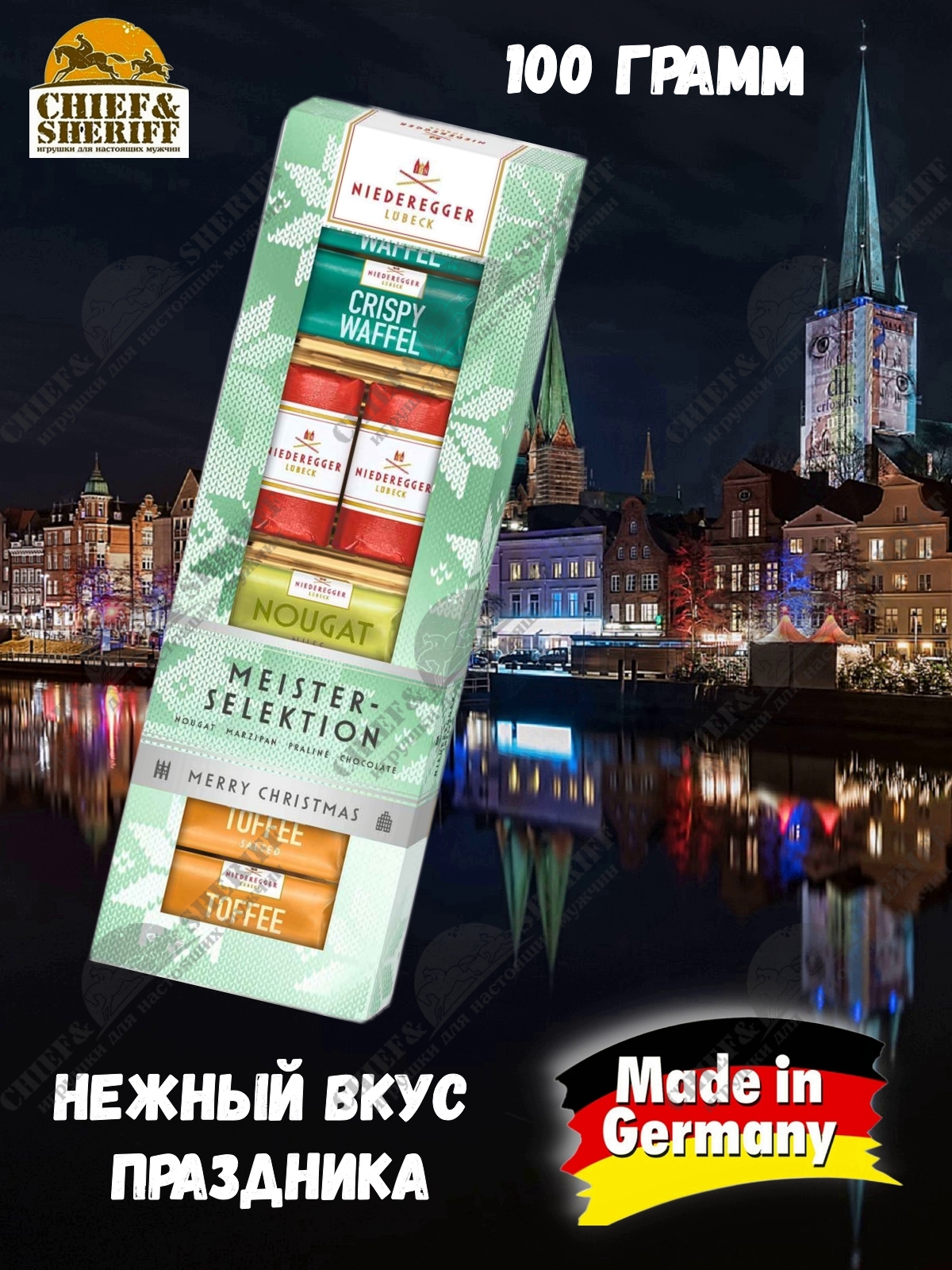 Лучший ассортимент для праздничных моментов. Niederegger Master Selection Merry Christmas сочетает в себе четыре изысканных варианта в стильной подарочной упаковке: хрустящие вафли, классический марципан, ореховая нуга с нежным тающим вкусом и солёный ирис с карамельным ароматом и лёгкой солоноватой ноткой. Каждый вариант предлагает уникальный вкус – изысканное исполнение и элегантное качество Niederegger, к которому вы привыкли. Идеально подходит для подарка, совместного времяпрепровождения или для себя. Праздничный выбор, который сделает Рождество ещё приятнее. В наборе 8 конфет: 2 x орех-нуга, 2 x хрустящая вафля, 2 x ириски, 2 x классический марципан