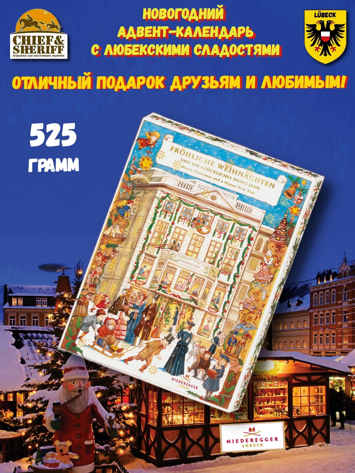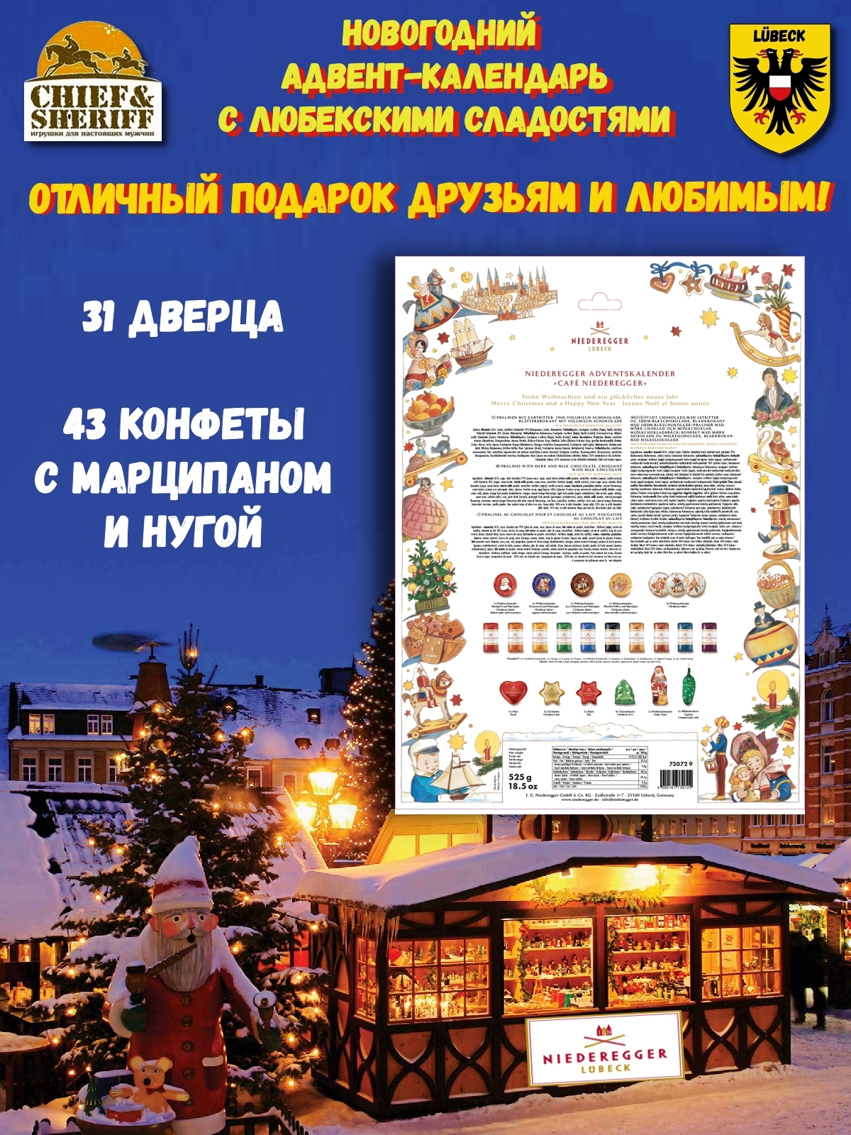 Традиционно и очень вкусно! Адвент-календарь Niederegger «Кафе Нидереггер» основан на ностальгическом мотиве и, в отличие от большинства адвент-календарей, предлагает больше маленьких дверц с 43 фирменными десертами из марципана и нуги в различных вариациях. Таким образом, вы можете наслаждаться восхитительным угощением каждый день до 1 января и встречать веселое Рождество и счастливый Новый год.