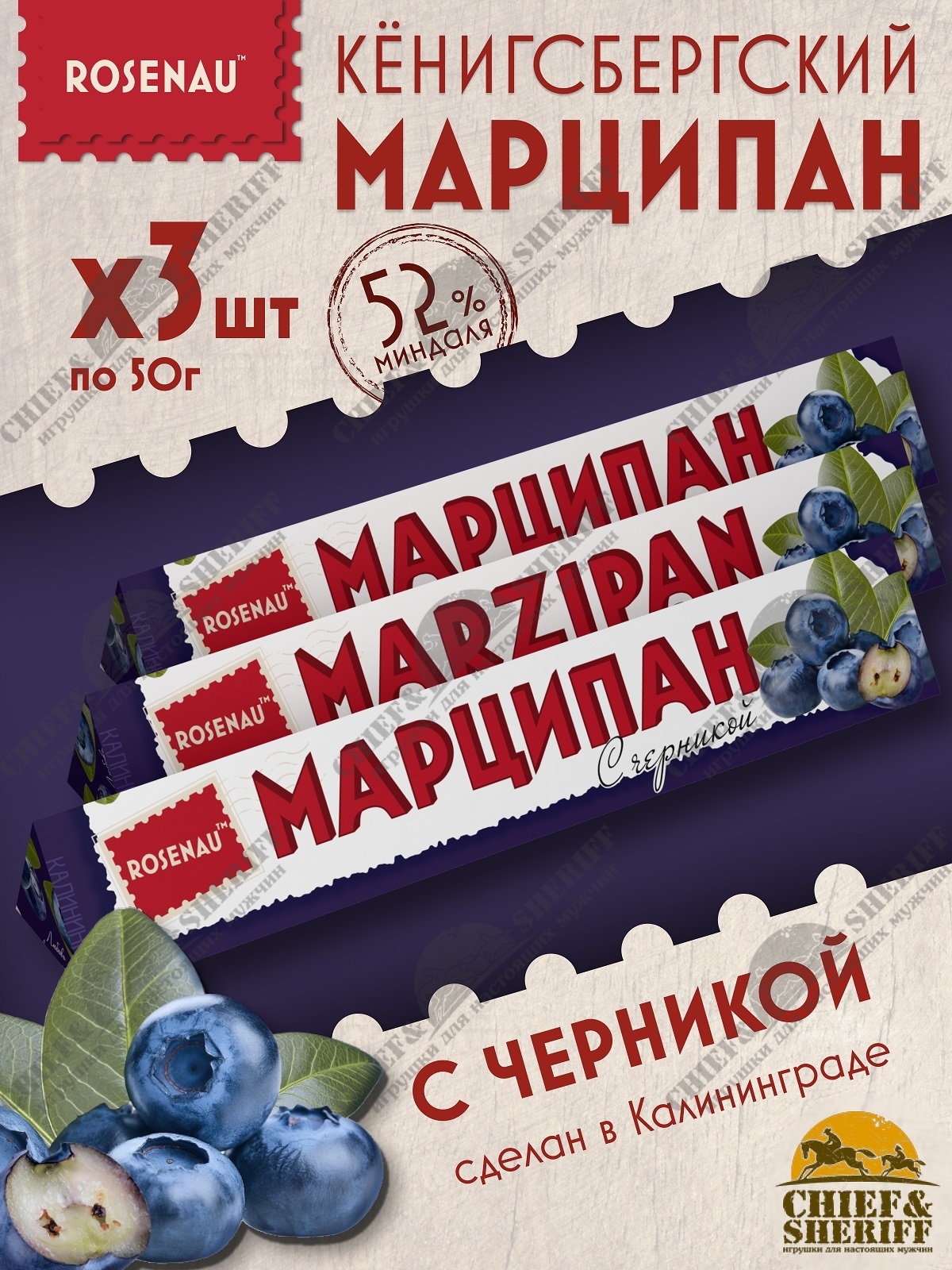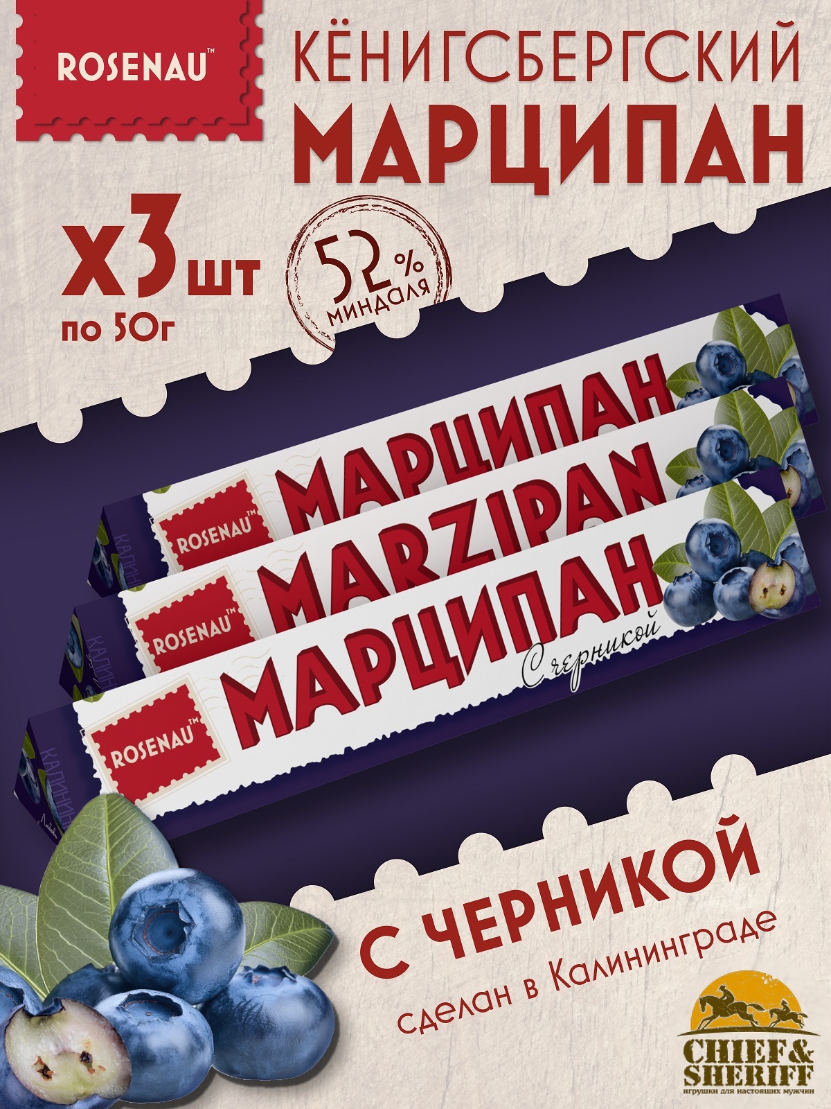 Марципан с черникой (миндаль 52%), ROSENAU, 3 X 50 гр