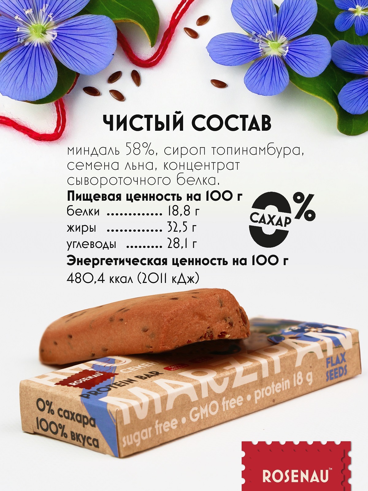 Состав миндаль 58%, семена льна, сироп топинамбура, концентрат сывороточного белка