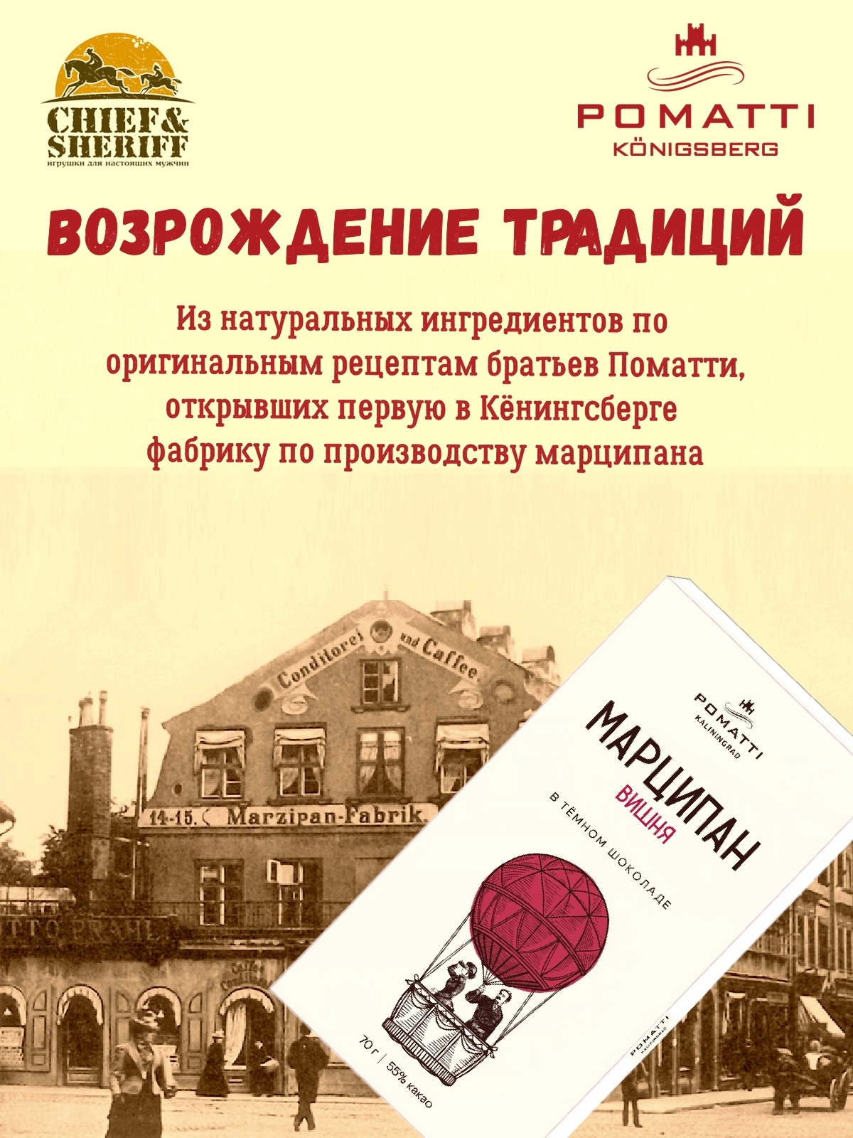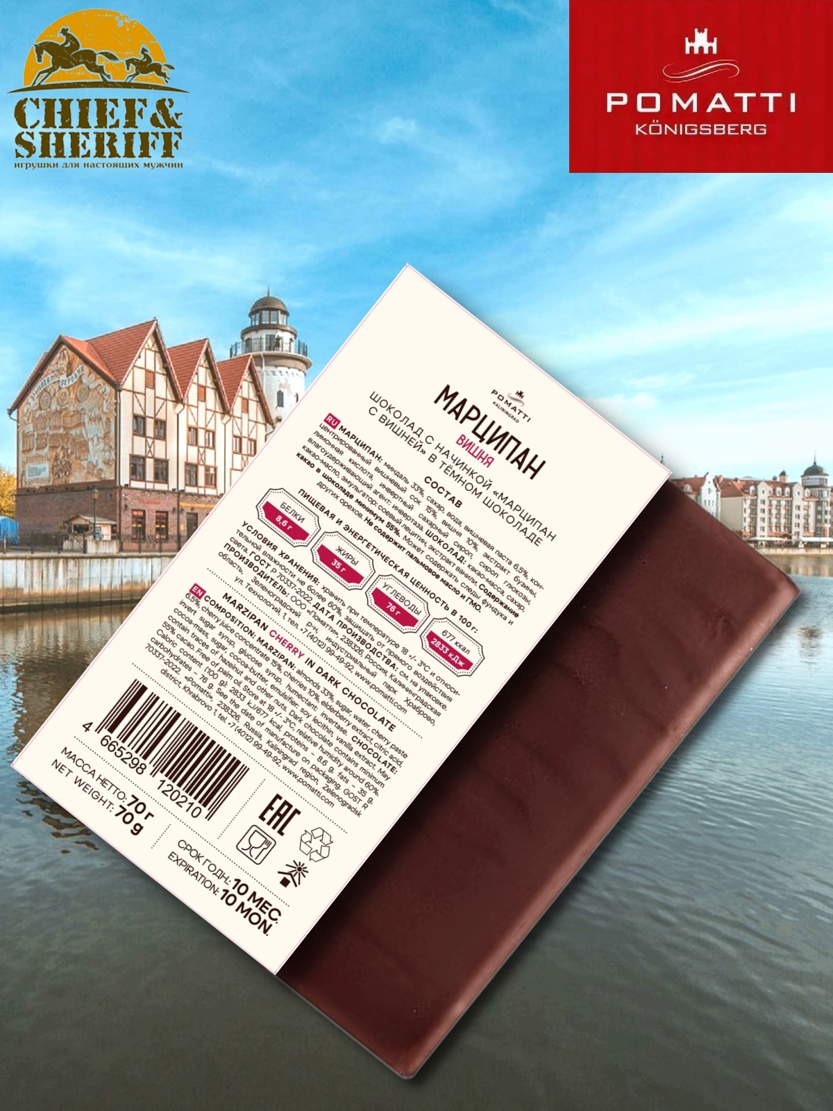 Созданный по традиционным рецептам, этот калининградский марципан сочетает в себе волшебный вкус сладкого миндаля и ароматную вишню, покрытую горьковатым темным шоколадом. Такой дуэт порадует даже самого взыскательного любителя сладостей и станет настоящим вкусным открытием.