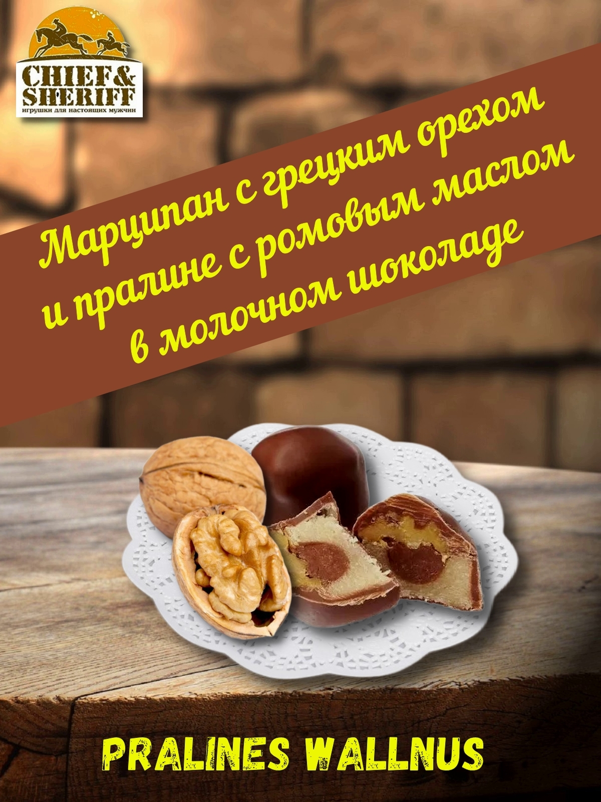 Подарочная упаковка с 6 марципановыми пралине в индивидуальной упаковке с грецкими орехами в ромовом масле и молочным шоколадом.