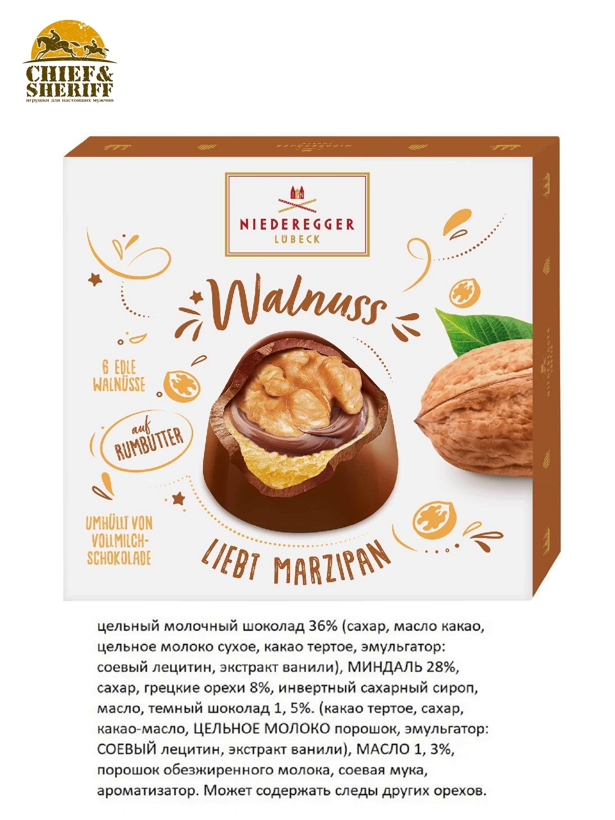 Грецкий орех Нидереггер на марципане — хрустящее творение для любителей марципана. Нежнейшие грецкие орехи и нежнейшее ромовое масло лежат на ложе из сочного марципана и покрыты слоем нежного молочного шоколада. Побалуйте себя этим изысканным сочетанием или подарите кому-нибудь особенно ароматное лакомство.