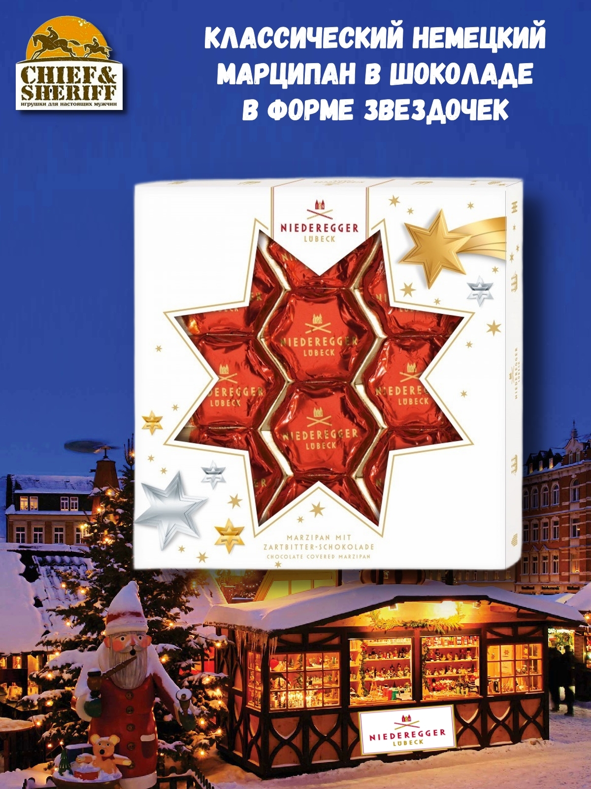 Классика. "Звезды" от Нидереггер не только отлично выглядят, но и имеет великолепный вкус. Этот сочный марципан из высококачественного миндаля покрытый хрустящим темным шоколадом, позволит вам предаться восхитительным снам. Рождественская упаковка создает необходимое настроение и идеально подходит для того, чтобы подарить шоколад в качестве небольшого сувенира любителям марципана.