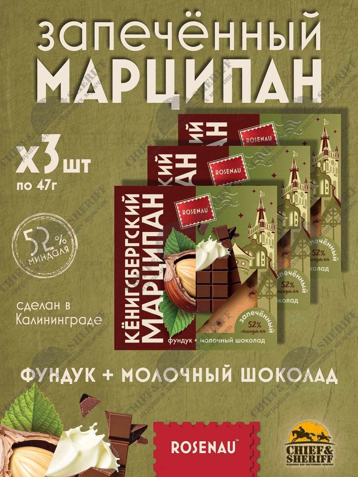 Марципан запеченный с фундуком и молочным шоколадом (миндаль 52%), ROSENAU, 3 X 50 гр
