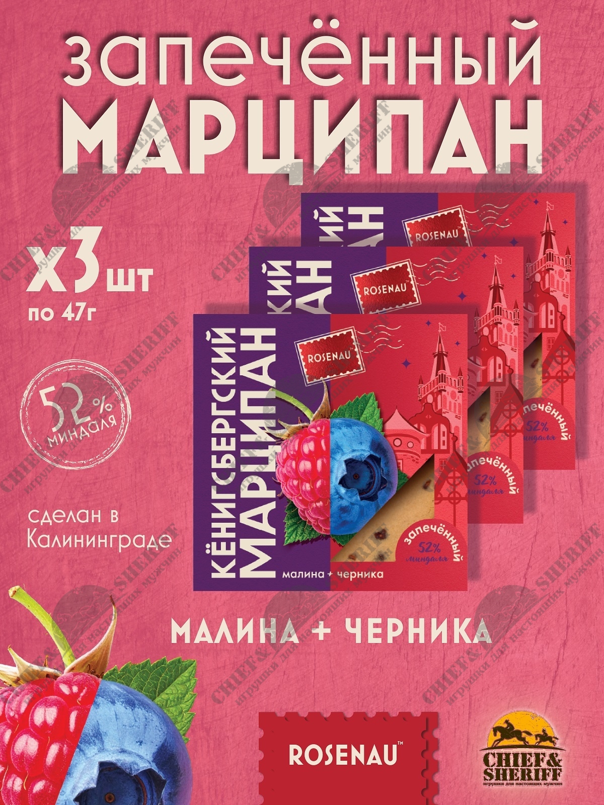 Марципан запеченный с малиной и черникой (миндаль 52%), ROSENAU, 3 X 50 гр