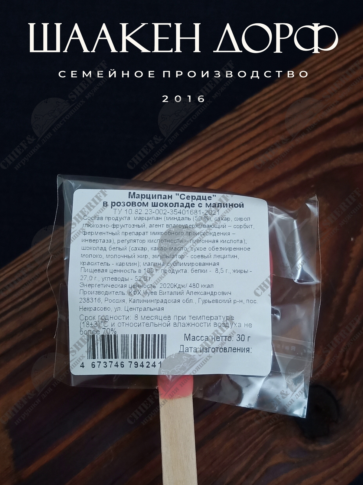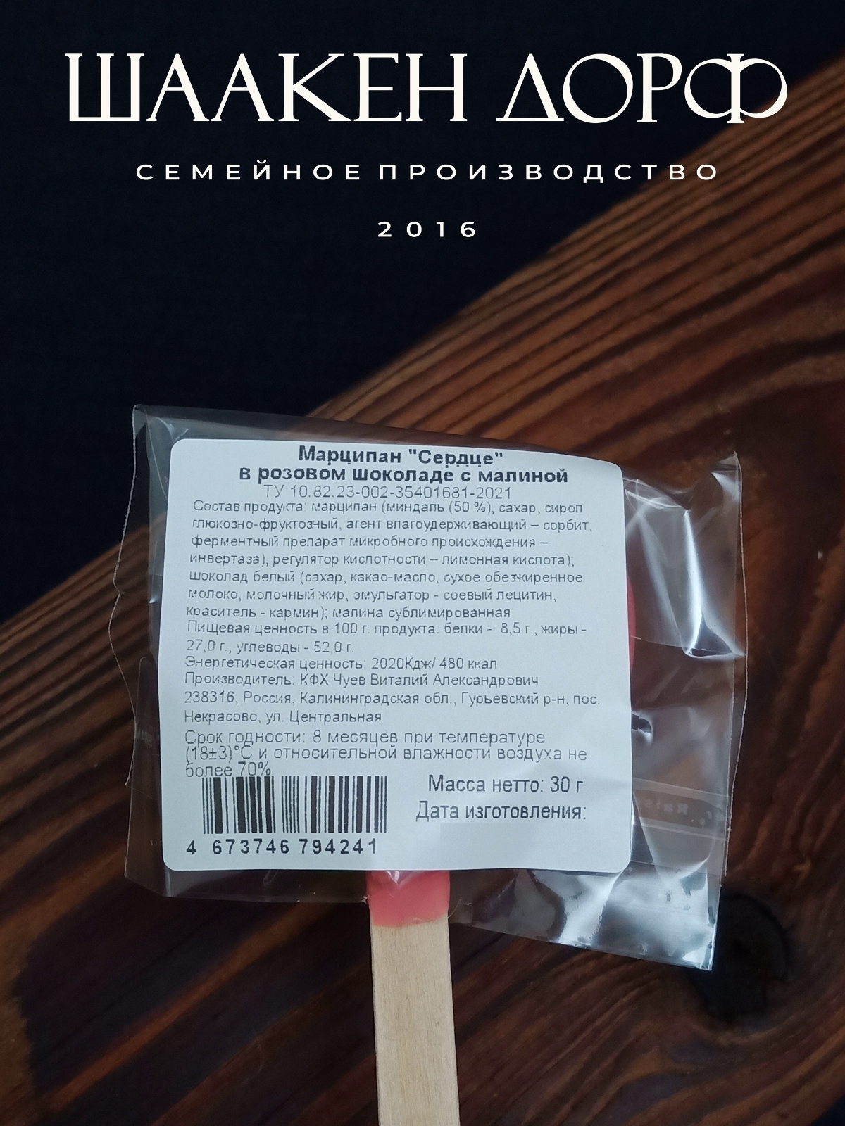 Шаакен Дорф - семейное производство сыра, марципана, шоколада, конфет и зефира. Производство компании Шаакен Дорф находится в Калининграде, в здании, которое когда-то было конюшней при замке Шаакен - рыцарей еще тевтонского ордена. Сейчас на первом этаже находится производство сыра. На втором этаже располагается небольшое кондитерское производство. Здесь вручную варится зефир, делаются карамелизированные апельсины в темном шоколаде, сублимированные ягоды, а также создается абсолютно разный и такой всеми полюбившийся калининградский марципан. В 2024 году, компания Шаакен Дорф стала победителем в номинациях «Лучшее туристическое направление года в номинации агротуризм», «Лучшее крестьянско-фермерское хозяйство», «Лучшее хозяйство в отрасли переработки молока», «Лучший объект туристического показа» и многих других! Марципан от Schaaken Dorf как минимум не уступает по качеству немецкому марципану от лучших производителей марципана из Германии. Попробуйте - и убедитесь сами!