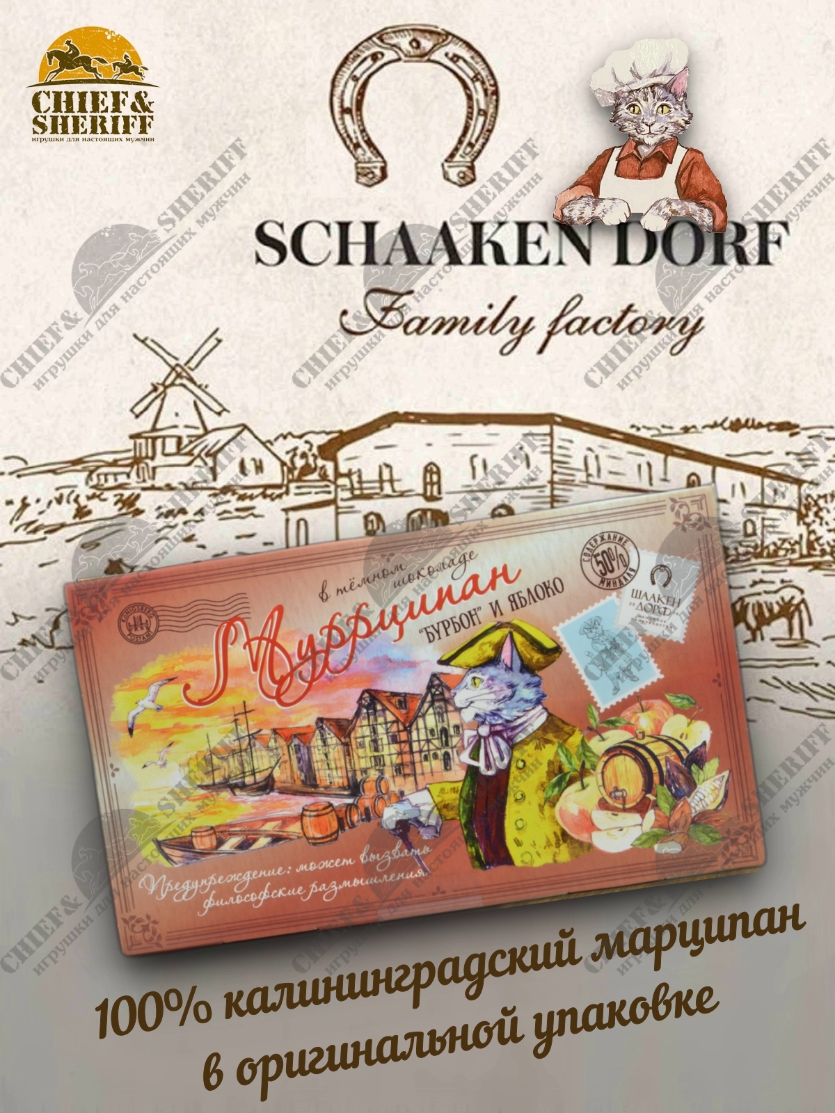 Муррципан - это настоящий калининградский марципан, изготовленный компанией Schaaken Dorf, обладательницей многих наград и дипломов. Шаакен Дорф - семейное производство сыра, марципана, шоколада, конфет и зефира, которое находится в Калининграде, в здании, которое когда-то было конюшней при замке Шаакен.