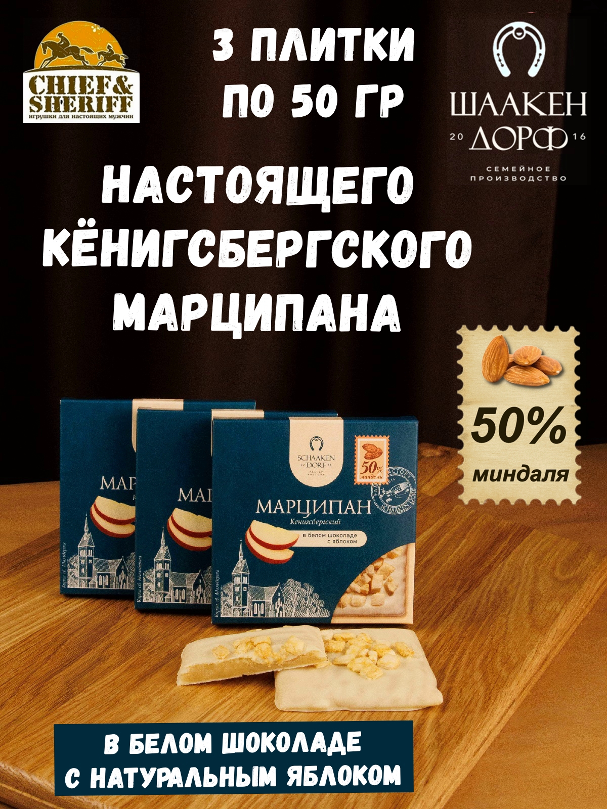 Марципановая плитка в белом шоколаде с яблоком, SCHAAKEN DORF, 3 X 50 гр