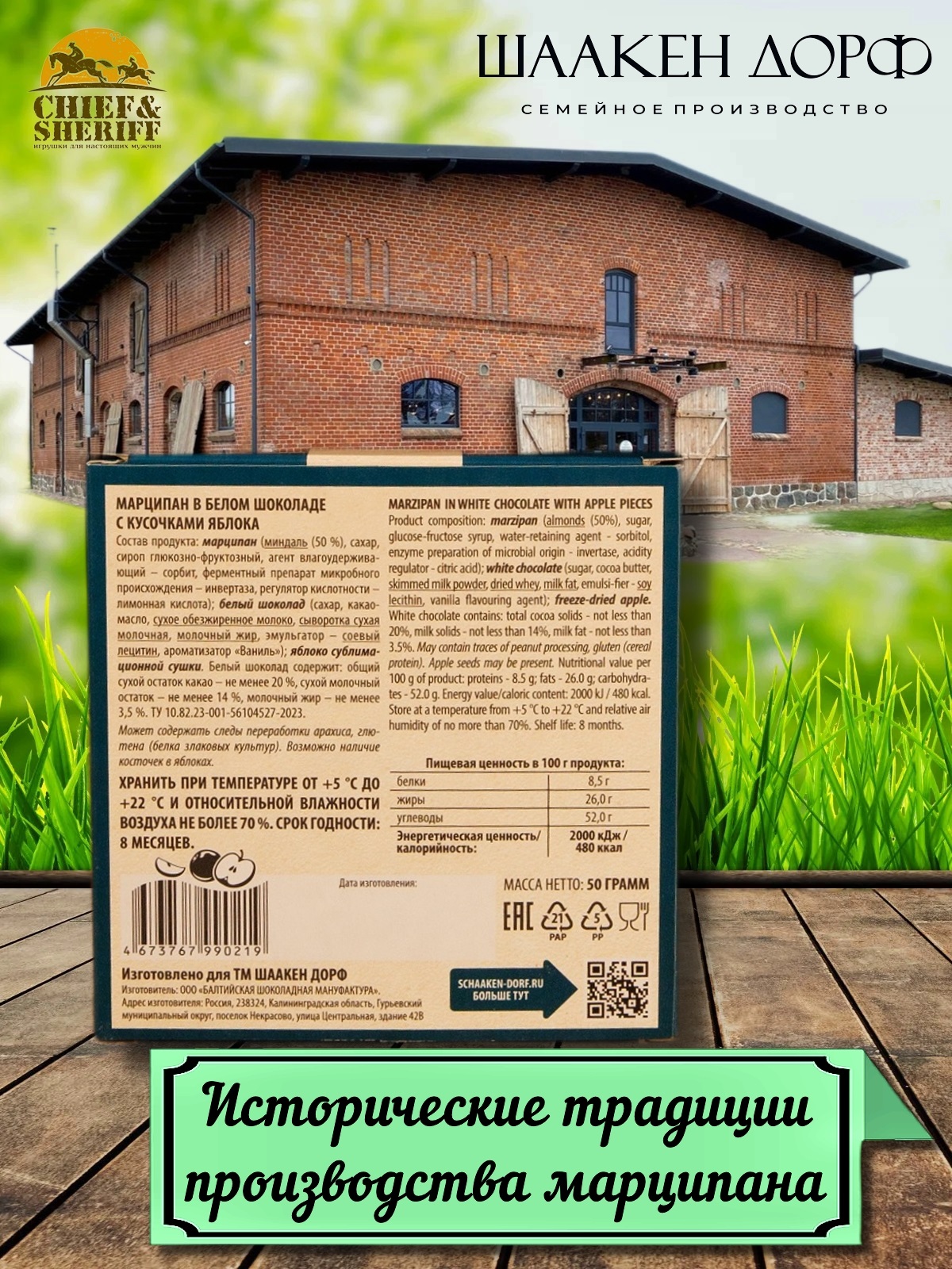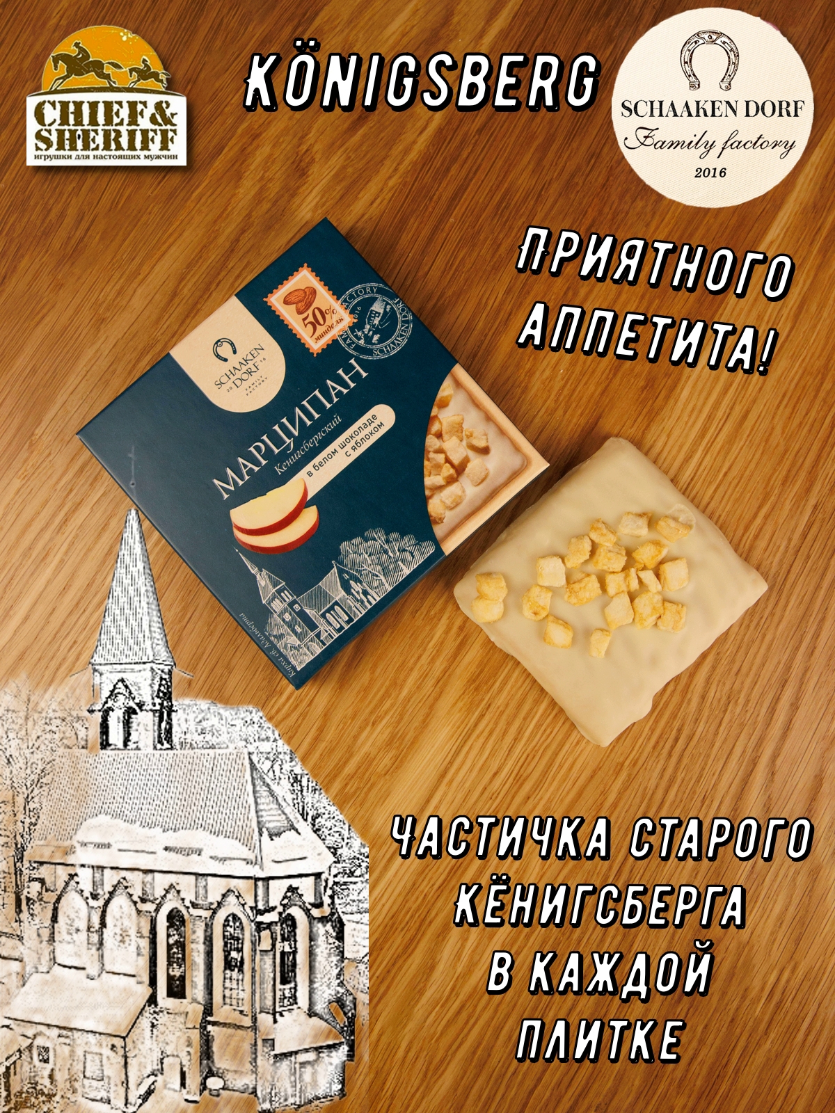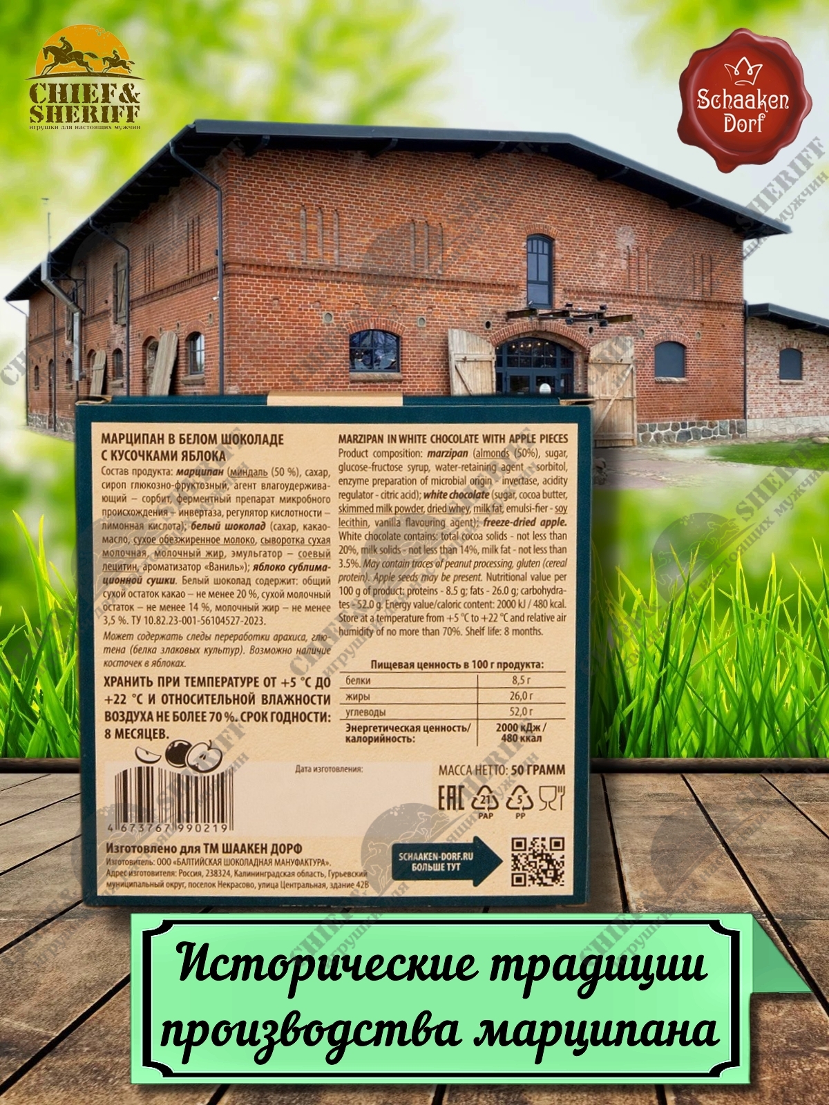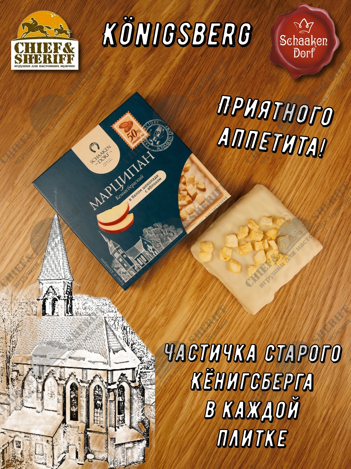Шаакен Дорф - семейное производство сыра, марципана, шоколада, конфет и зефира. Производство компании Шаакен Дорф находится в Калининграде, в здании, которое когда-то было конюшней при замке Шаакен - рыцарей еще тевтонского ордена. Сейчас на первом этаже находится производство сыра. На втором этаже располагается небольшое кондитерское производство. Здесь вручную варится зефир, делаются карамелизированные апельсины в темном шоколаде, сублимированные ягоды, а также создается абсолютно разный и такой всеми полюбившийся калининградский марципан. В 2024 году, компания Шаакен Дорф стала победителем в номинациях «Лучшее туристическое направление года в номинации агротуризм», «Лучшее крестьянско-фермерское хозяйство», «Лучшее хозяйство в отрасли переработки молока», «Лучший объект туристического показа» и многих других! Марципан от Schaaken Dorf как минимум не уступает по качеству немецкому марципану от лучших производителей марципана из Германии. Попробуйте - и убедитесь сами!