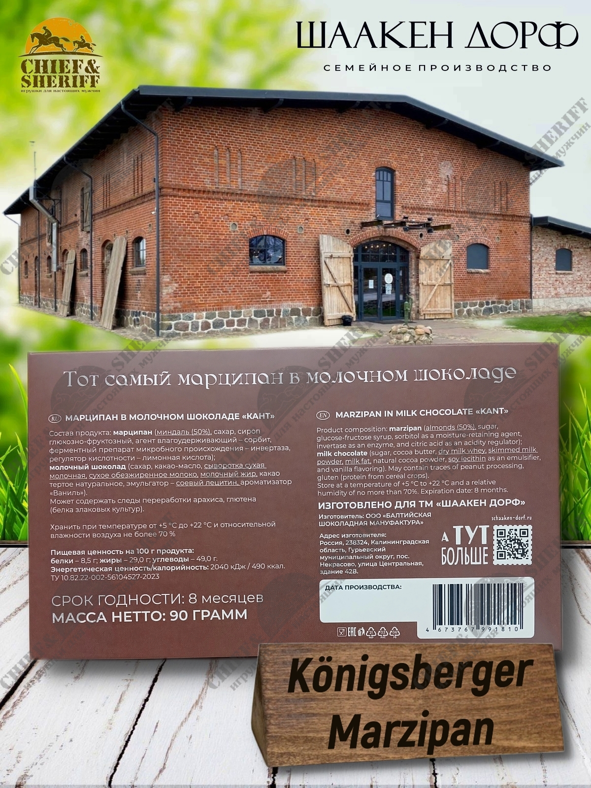 Марципан изготовлен компанией Schaaken Dorf. Шаакен Дорф - семейное производство сыра, марципана, шоколада, конфет и зефира, которое находится в Калининграде, в здании, которое когда-то было конюшней при замке Шаакен. В 2024 году, компания Шаакен Дорф стала победителем в номинациях «Лучшее туристическое направление года в номинации агротуризм», «Лучшее крестьянско-фермерское хозяйство» и многих других!