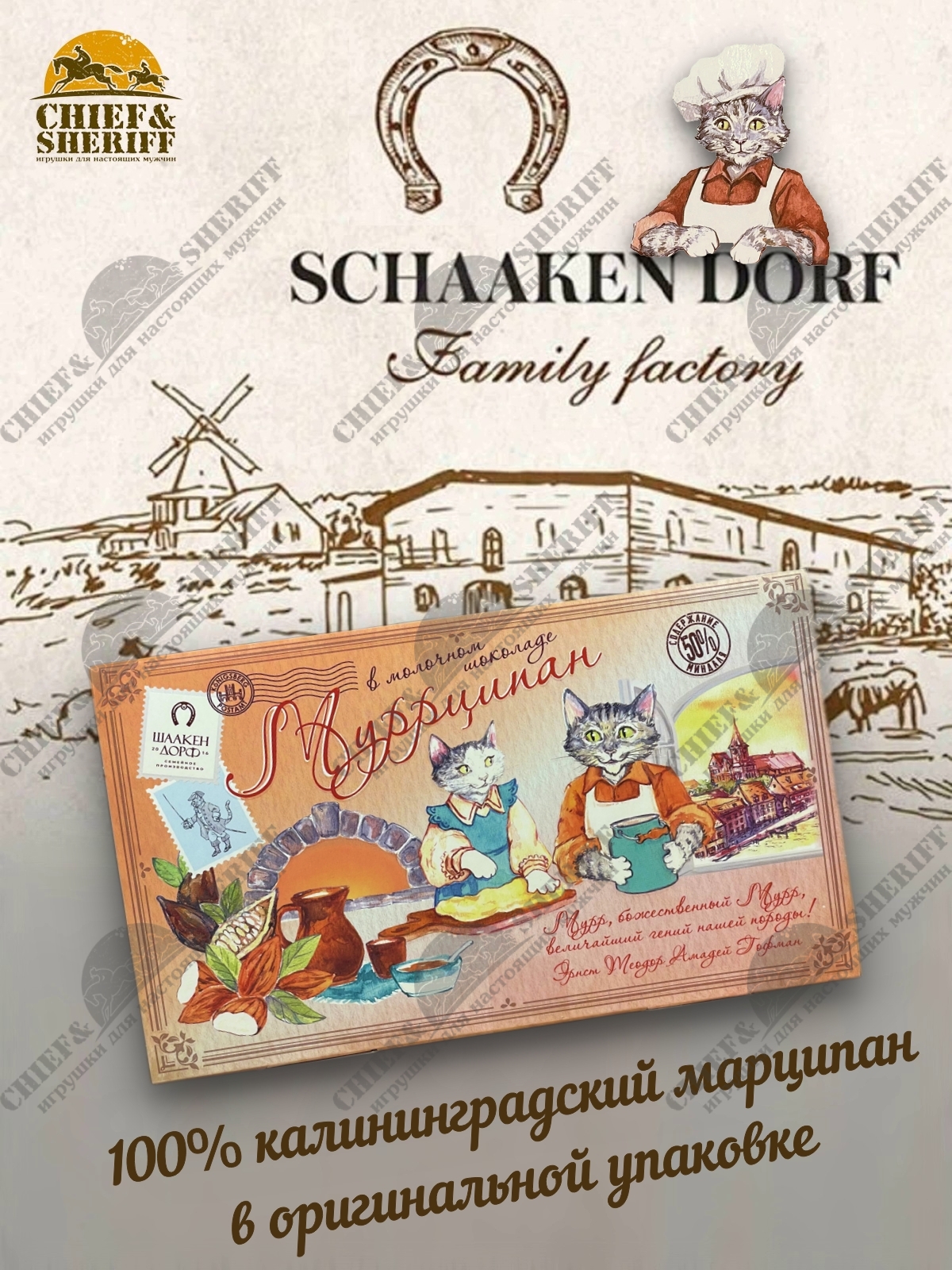 Муррципан - это настоящий калининградский марципан, изготовленный компанией Schaaken Dorf, обладательницей многих наград и дипломов. Шаакен Дорф - семейное производство сыра, марципана, шоколада, конфет и зефира, которое находится в Калининграде, в здании, которое когда-то было конюшней при замке Шаакен.
