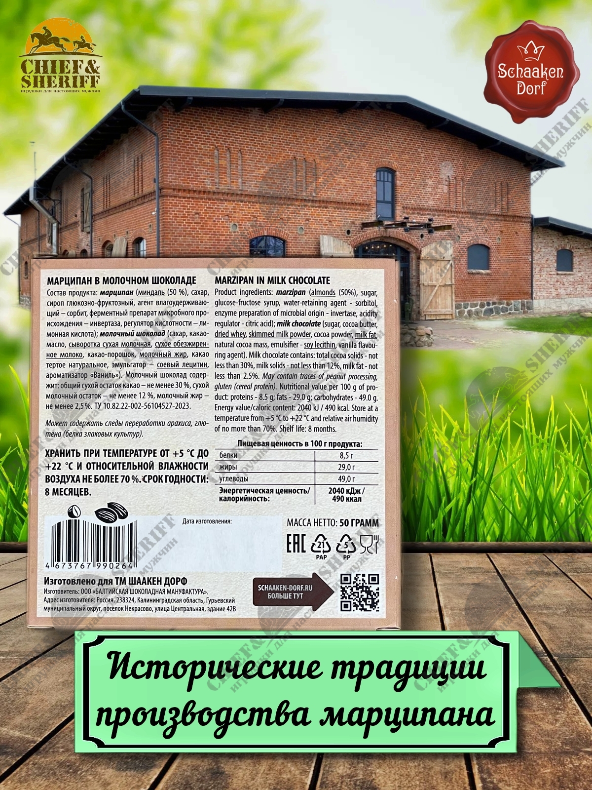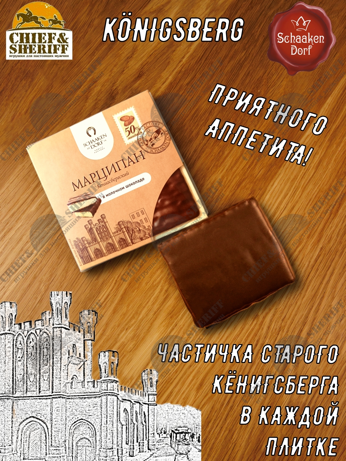 Шаакен Дорф - семейное производство сыра, марципана, шоколада, конфет и зефира. Производство компании Шаакен Дорф находится в Калининграде, в здании, которое когда-то было конюшней при замке Шаакен - рыцарей еще тевтонского ордена. Сейчас на первом этаже находится производство сыра. На втором этаже располагается небольшое кондитерское производство. Здесь вручную варится зефир, делаются карамелизированные апельсины в темном шоколаде, сублимированные ягоды, а также создается абсолютно разный и такой всеми полюбившийся калининградский марципан. В 2024 году, компания Шаакен Дорф стала победителем в номинациях «Лучшее туристическое направление года в номинации агротуризм», «Лучшее крестьянско-фермерское хозяйство», «Лучшее хозяйство в отрасли переработки молока», «Лучший объект туристического показа» и многих других! Марципан от Schaaken Dorf как минимум не уступает по качеству немецкому марципану от лучших производителей марципана из Германии. Попробуйте - и убедитесь сами!