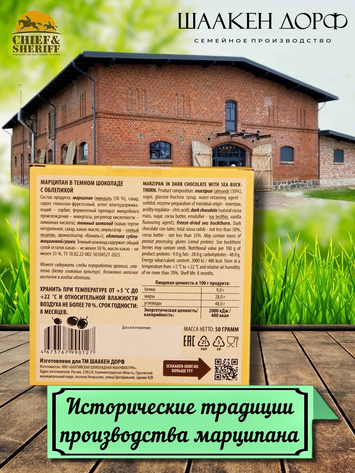 Шаакен Дорф - семейное производство сыра, марципана, шоколада, конфет и зефира. Производство компании Шаакен Дорф находится в Калининграде, в здании, которое когда-то было конюшней при замке Шаакен - рыцарей еще тевтонского ордена. Сейчас на первом этаже находится производство сыра. На втором этаже располагается небольшое кондитерское производство. Здесь вручную варится зефир, делаются карамелизированные апельсины в темном шоколаде, сублимированные ягоды, а также создается абсолютно разный и такой всеми полюбившийся калининградский марципан. В 2024 году, компания Шаакен Дорф стала победителем в номинациях «Лучшее туристическое направление года в номинации агротуризм», «Лучшее крестьянско-фермерское хозяйство», «Лучшее хозяйство в отрасли переработки молока», «Лучший объект туристического показа» и многих других! Марципан от Schaaken Dorf как минимум не уступает по качеству немецкому марципану от лучших производителей марципана из Германии. Попробуйте - и убедитесь сами!