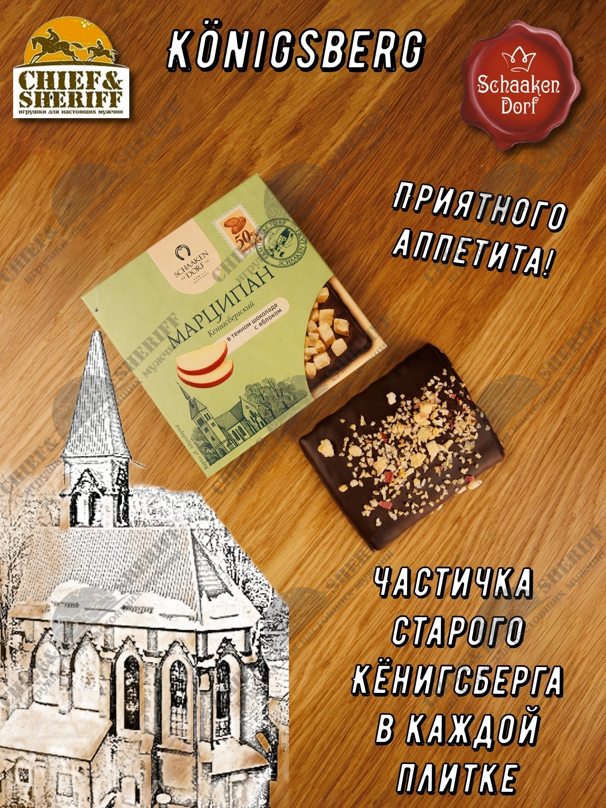 Шаакен Дорф - семейное производство сыра, марципана, шоколада, конфет и зефира. Производство компании Шаакен Дорф находится в Калининграде, в здании, которое когда-то было конюшней при замке Шаакен - рыцарей еще тевтонского ордена. Сейчас на первом этаже находится производство сыра. На втором этаже располагается небольшое кондитерское производство. Здесь вручную варится зефир, делаются карамелизированные апельсины в темном шоколаде, сублимированные ягоды, а также создается абсолютно разный и такой всеми полюбившийся калининградский марципан. В 2024 году, компания Шаакен Дорф стала победителем в номинациях «Лучшее туристическое направление года в номинации агротуризм», «Лучшее крестьянско-фермерское хозяйство», «Лучшее хозяйство в отрасли переработки молока», «Лучший объект туристического показа» и многих других! Марципан от Schaaken Dorf как минимум не уступает по качеству немецкому марципану от лучших производителей марципана из Германии. Попробуйте - и убедитесь сами!