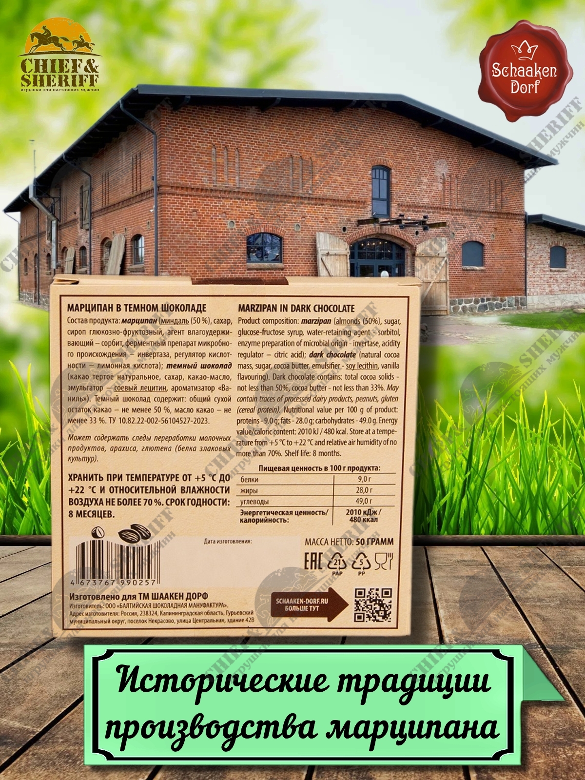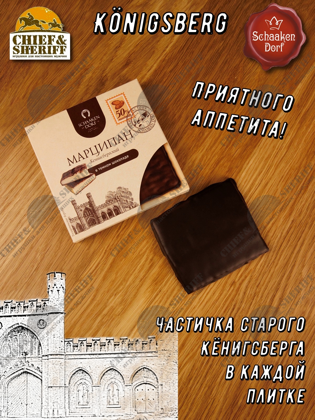 Шаакен Дорф - семейное производство сыра, марципана, шоколада, конфет и зефира. Производство компании Шаакен Дорф находится в Калининграде, в здании, которое когда-то было конюшней при замке Шаакен - рыцарей еще тевтонского ордена. Сейчас на первом этаже находится производство сыра. На втором этаже располагается небольшое кондитерское производство. Здесь вручную варится зефир, делаются карамелизированные апельсины в темном шоколаде, сублимированные ягоды, а также создается абсолютно разный и такой всеми полюбившийся калининградский марципан. В 2024 году, компания Шаакен Дорф стала победителем в номинациях «Лучшее туристическое направление года в номинации агротуризм», «Лучшее крестьянско-фермерское хозяйство», «Лучшее хозяйство в отрасли переработки молока», «Лучший объект туристического показа» и многих других! Марципан от Schaaken Dorf как минимум не уступает по качеству немецкому марципану от лучших производителей марципана из Германии. Попробуйте - и убедитесь сами!