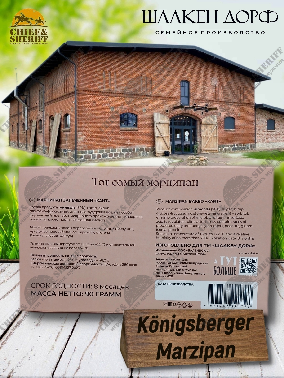 Марципан изготовлен компанией Schaaken Dorf. Шаакен Дорф - семейное производство сыра, марципана, шоколада, конфет и зефира, которое находится в Калининграде, в здании, которое когда-то было конюшней при замке Шаакен. В 2024 году, компания Шаакен Дорф стала победителем в номинациях «Лучшее туристическое направление года в номинации агротуризм», «Лучшее крестьянско-фермерское хозяйство» и многих других!