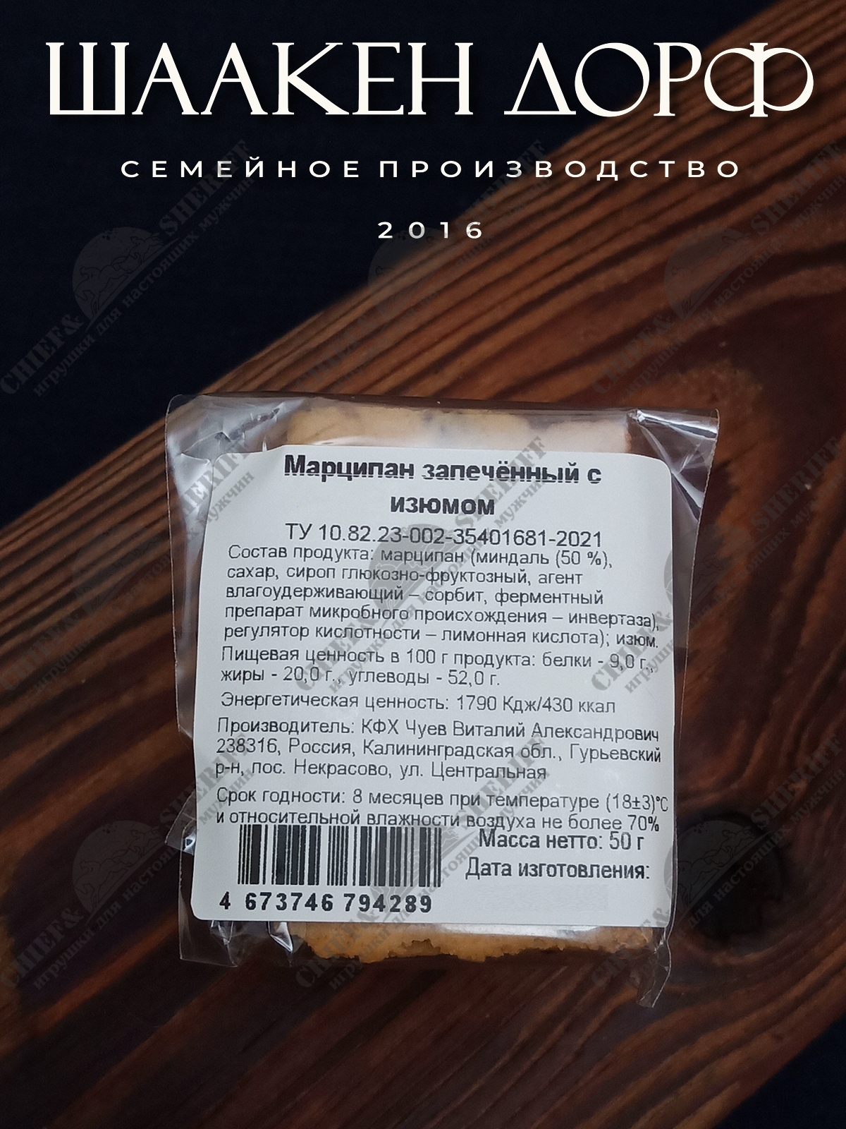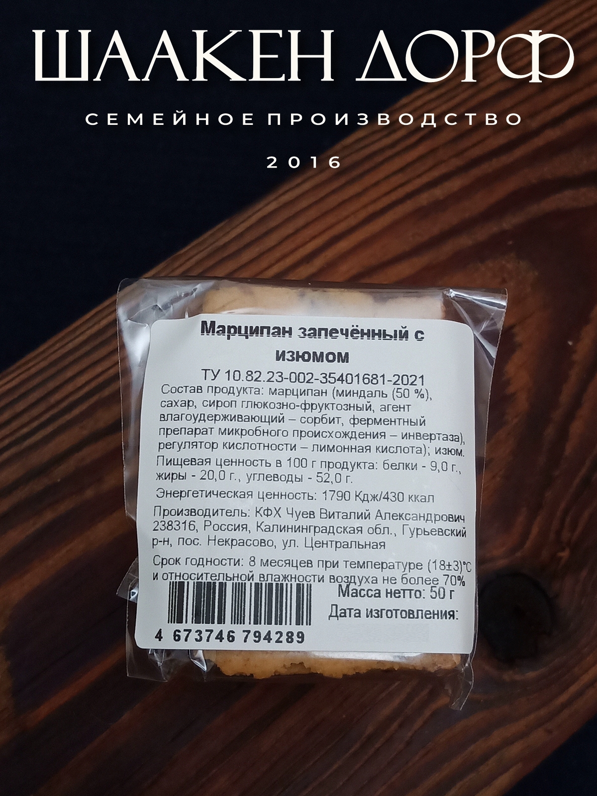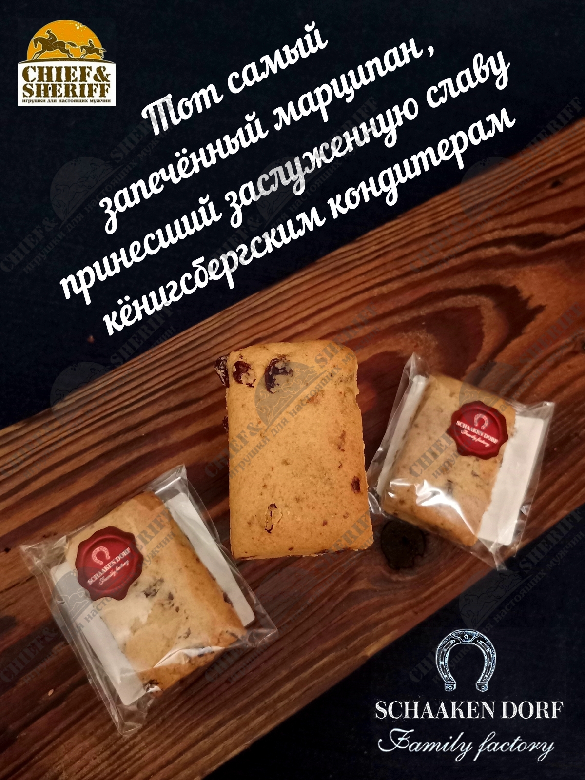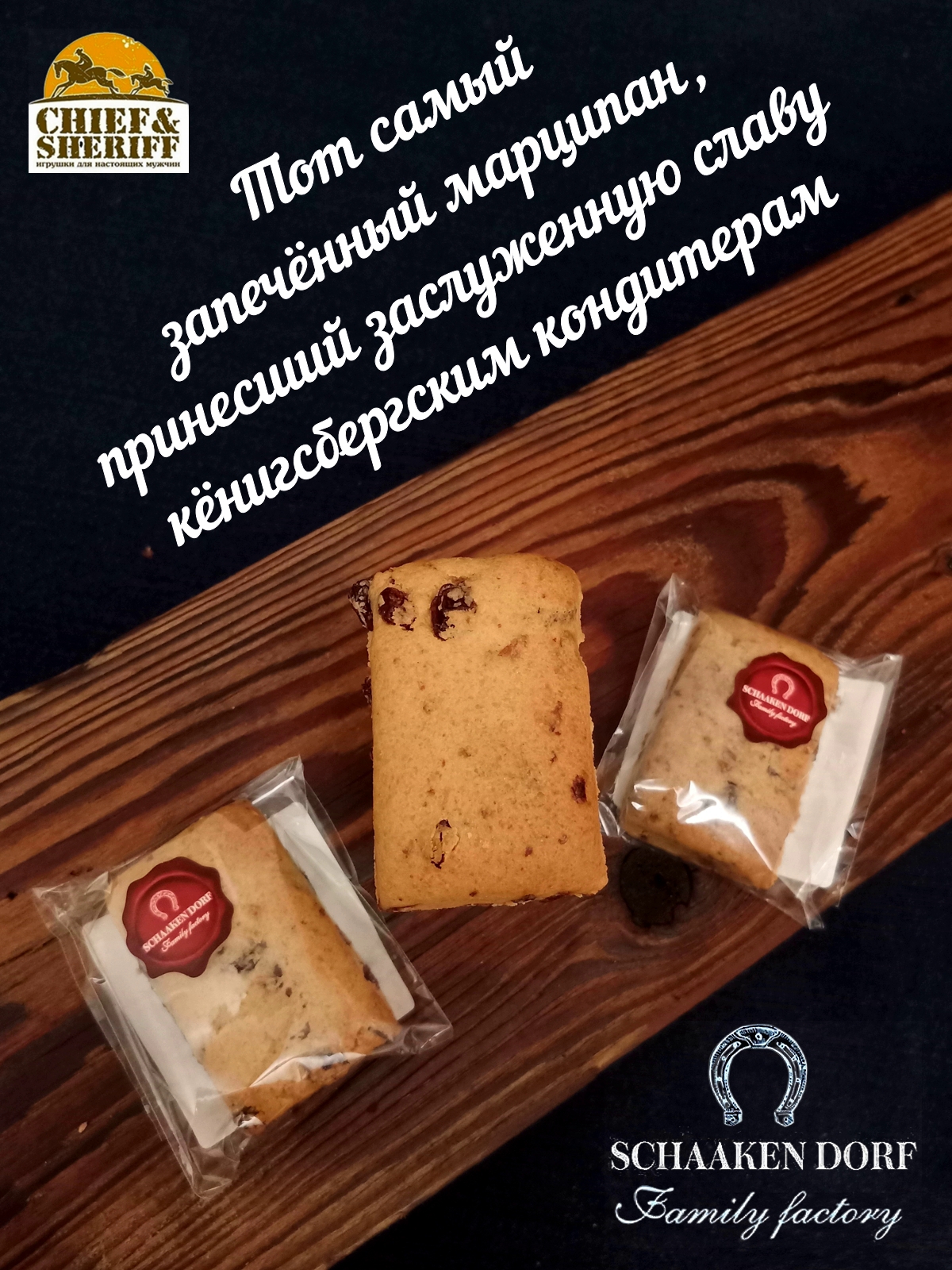 Шаакен Дорф - семейное производство сыра, марципана, шоколада, конфет и зефира. Производство компании Шаакен Дорф находится в Калининграде, в здании, которое когда-то было конюшней при замке Шаакен - рыцарей еще тевтонского ордена. Сейчас на первом этаже находится производство сыра. На втором этаже располагается небольшое кондитерское производство. Здесь вручную варится зефир, делаются карамелизированные апельсины в темном шоколаде, сублимированные ягоды, а также создается абсолютно разный и такой всеми полюбившийся калининградский марципан. В 2024 году, компания Шаакен Дорф стала победителем в номинациях «Лучшее туристическое направление года в номинации агротуризм», «Лучшее крестьянско-фермерское хозяйство» и многих других! Марципан от Schaaken Dorf как минимум не уступает по качеству немецкому марципану от лучших производителей марципана из Германии. Попробуйте - и убедитесь сами!