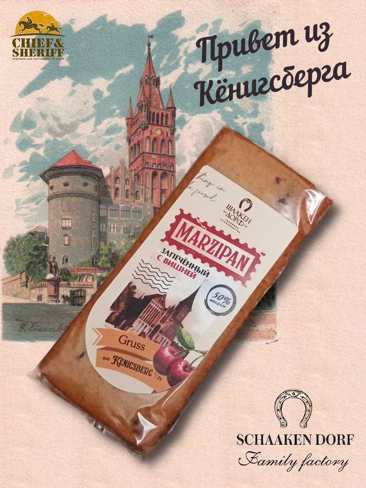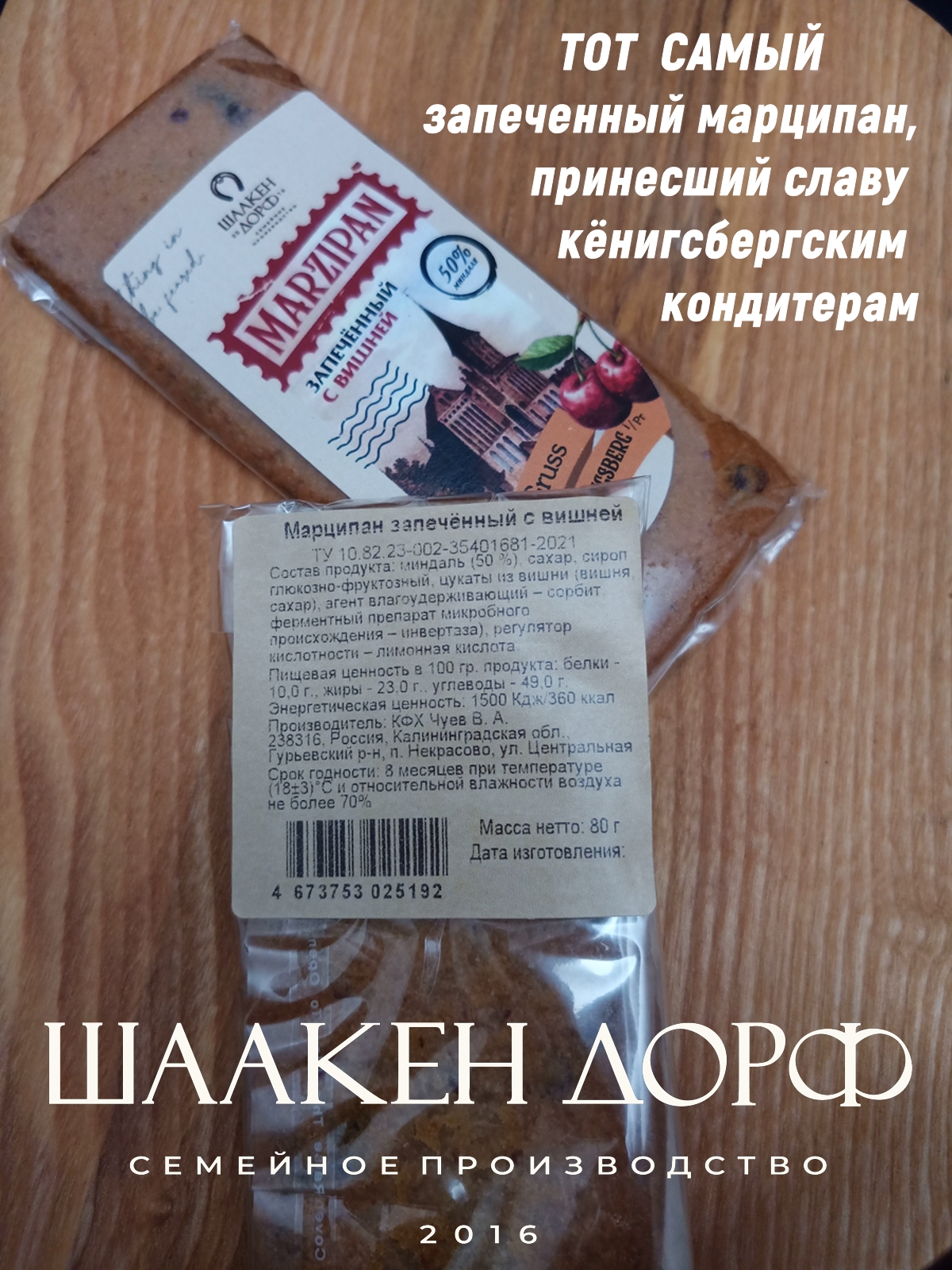 Шаакен Дорф - семейное производство сыра, марципана, шоколада, конфет и зефира. Производство компании Шаакен Дорф находится в Калининграде, в здании, которое когда-то было конюшней при замке Шаакен - рыцарей еще тевтонского ордена. Сейчас на первом этаже находится производство сыра. На втором этаже располагается небольшое кондитерское производство. Здесь вручную варится зефир, делаются карамелизированные апельсины в темном шоколаде, сублимированные ягоды, а также создается абсолютно разный и такой всеми полюбившийся калининградский марципан. В 2024 году, компания Шаакен Дорф стала победителем в номинациях «Лучшее туристическое направление года в номинации агротуризм», «Лучшее крестьянско-фермерское хозяйство», «Лучшее хозяйство в отрасли переработки молока» и многих других! Марципан от Schaaken Dorf как минимум не уступает по качеству немецкому марципану от лучших производителей марципана из Германии. Попробуйте - и убедитесь сами!