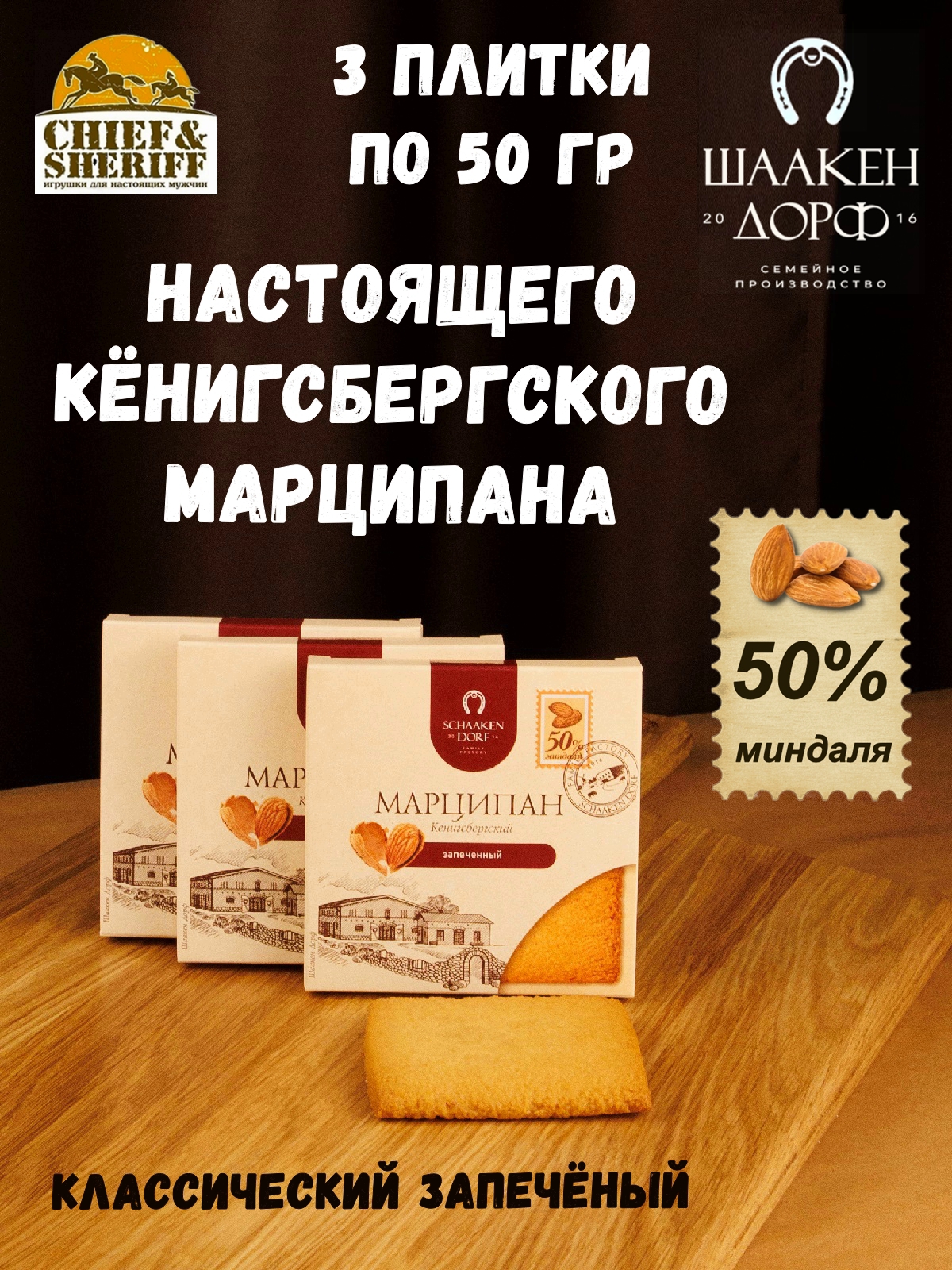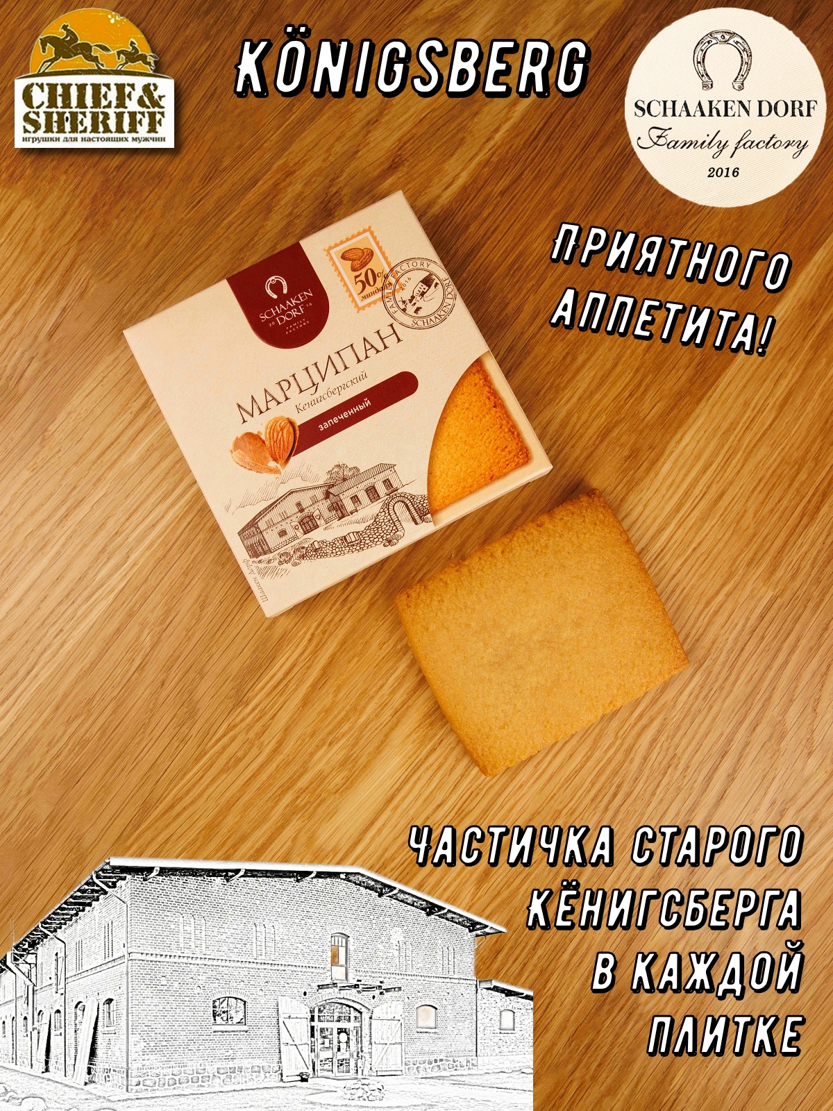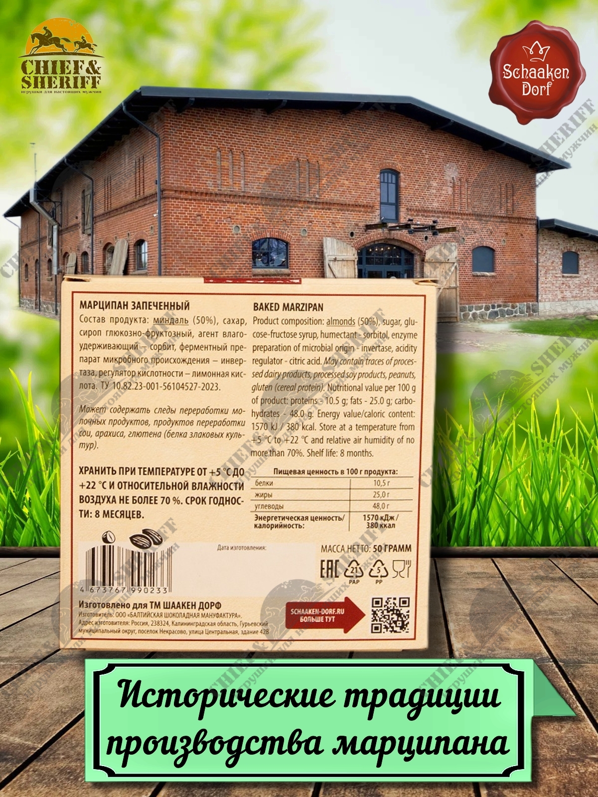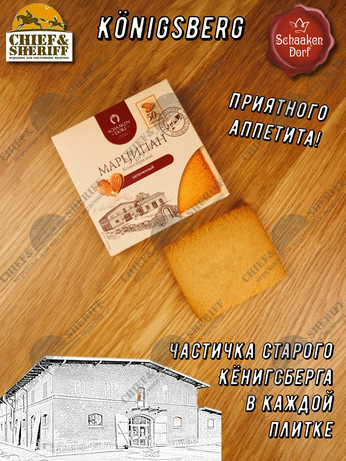 Шаакен Дорф - семейное производство сыра, марципана, шоколада, конфет и зефира. Производство компании Шаакен Дорф находится в Калининграде, в здании, которое когда-то было конюшней при замке Шаакен - рыцарей еще тевтонского ордена. Сейчас на первом этаже находится производство сыра. На втором этаже располагается небольшое кондитерское производство. Здесь вручную варится зефир, делаются карамелизированные апельсины в темном шоколаде, сублимированные ягоды, а также создается абсолютно разный и такой всеми полюбившийся калининградский марципан. В 2024 году, компания Шаакен Дорф стала победителем в номинациях «Лучшее туристическое направление года в номинации агротуризм», «Лучшее крестьянско-фермерское хозяйство», «Лучшее хозяйство в отрасли переработки молока», «Лучший объект туристического показа» и многих других! Марципан от Schaaken Dorf как минимум не уступает по качеству немецкому марципану от лучших производителей марципана из Германии. Попробуйте - и убедитесь сами!